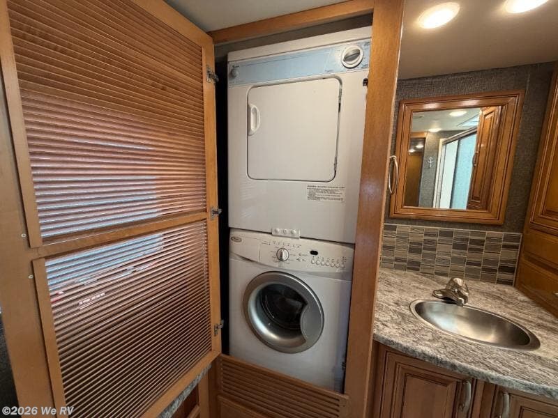 Slide the rear bath door open to find a shower, toilet, vanity with sink including linen storage, and a stackable washer and dryer location. No more lugging your dirty clothes home!