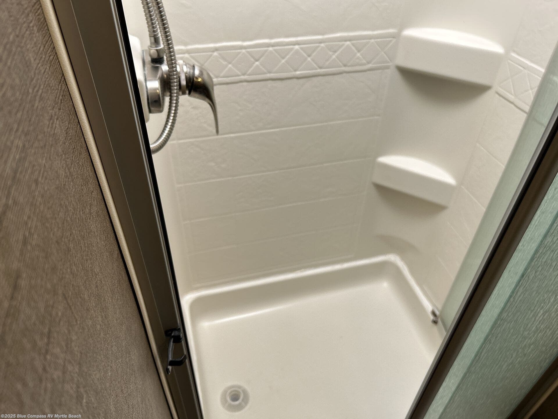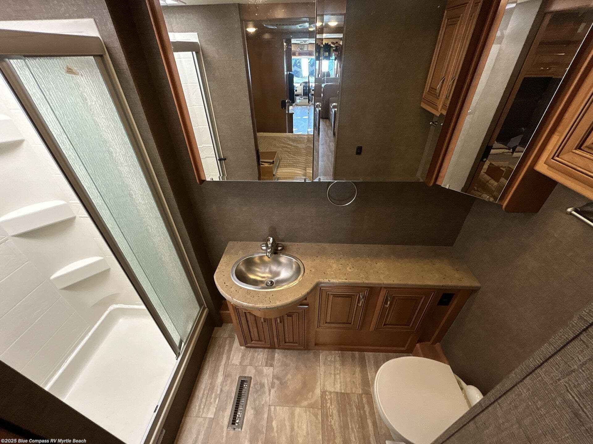 In the rear of the coach you will find a full bath with a toilet, a vanity sink, and a 36" x 30" shower.