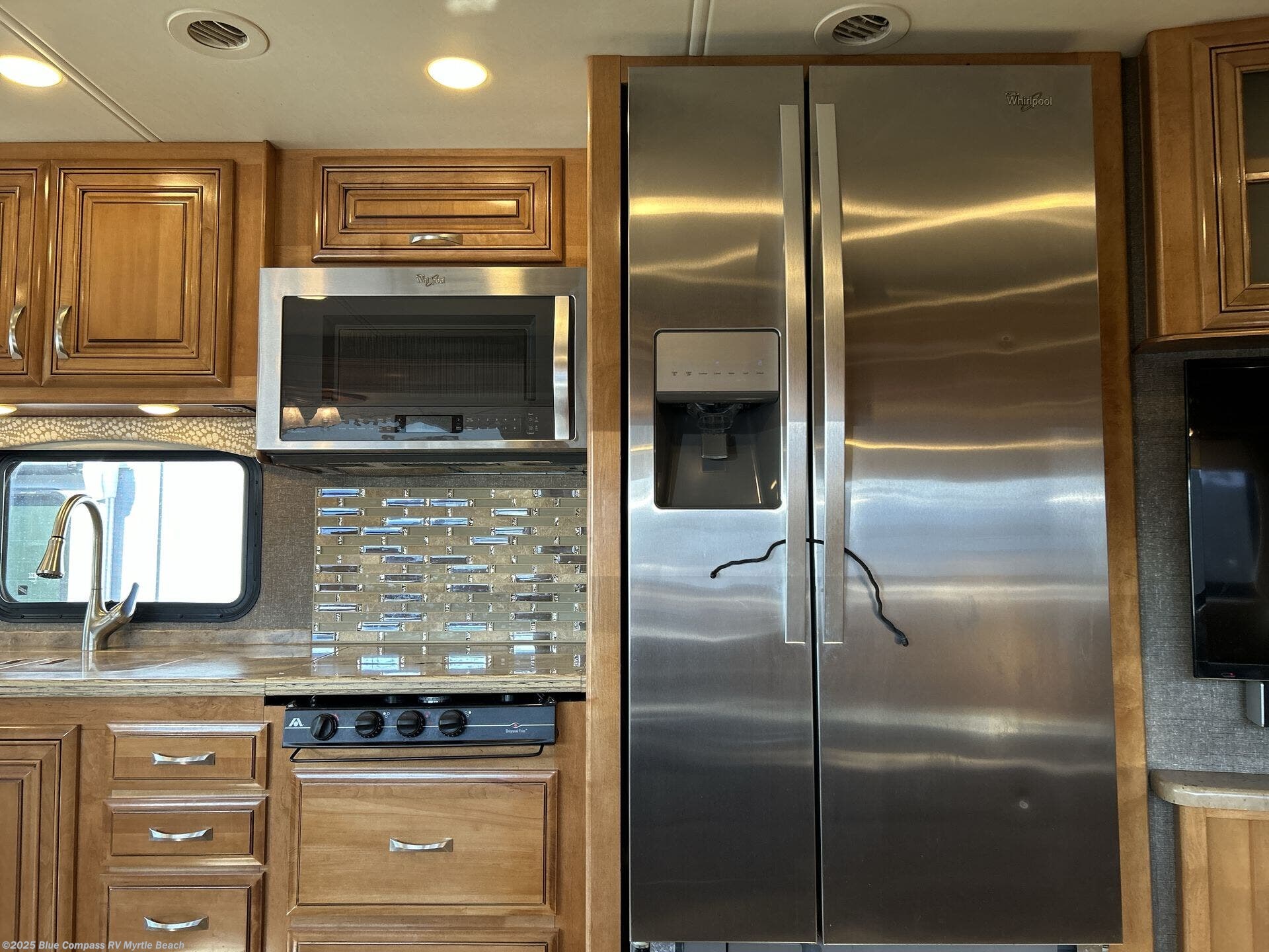 Along the door side you will find a double kitchen sink, three burner range with microwave oven above, and a residential refrigerator.
