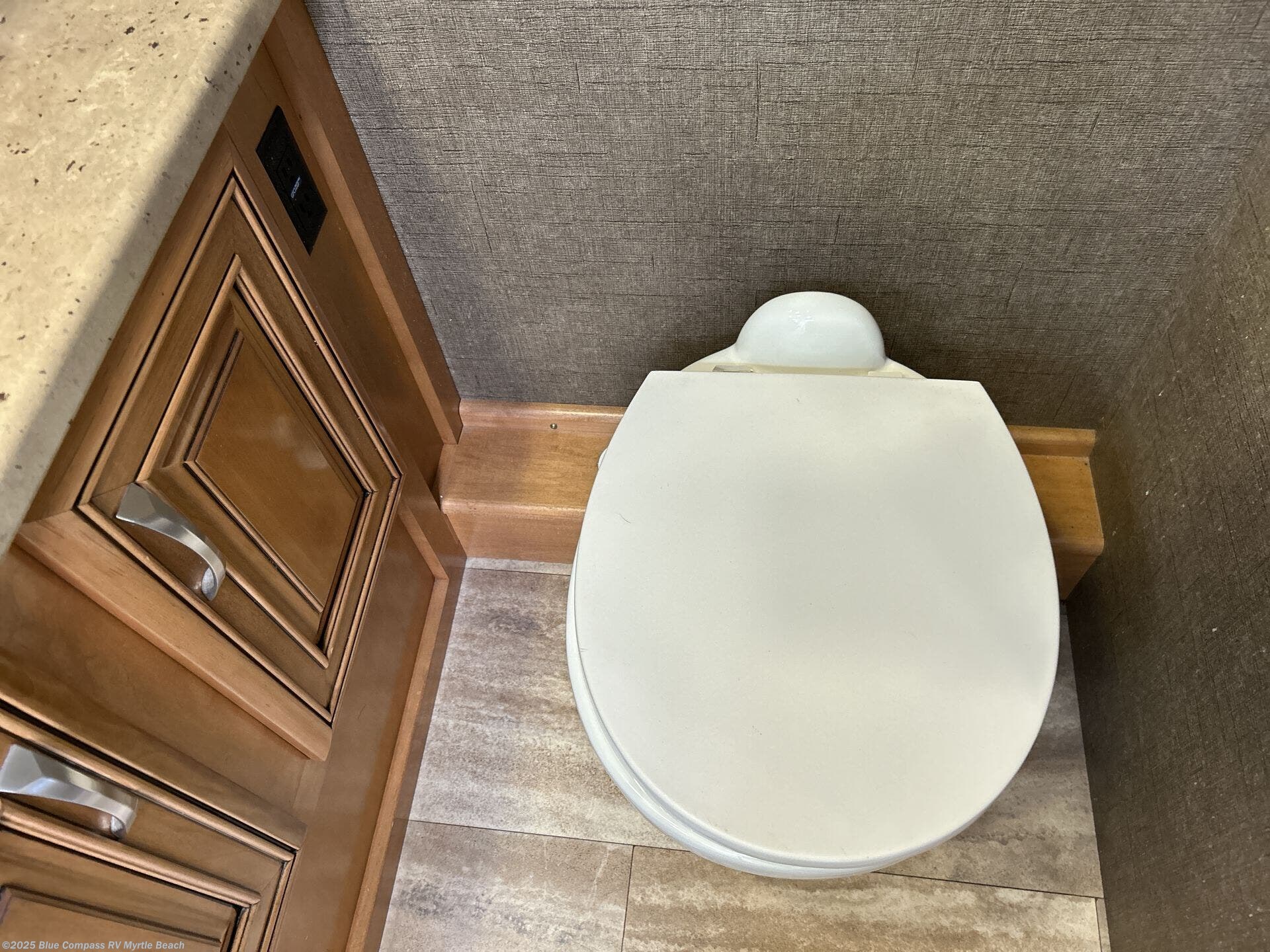 A half bath includes a toilet, linen storage, and a sink with vanity is located in the mid section of the coach. There is a 40" LED TV along the outside bathroom wall mounted above a fireplace which includes a remote.
