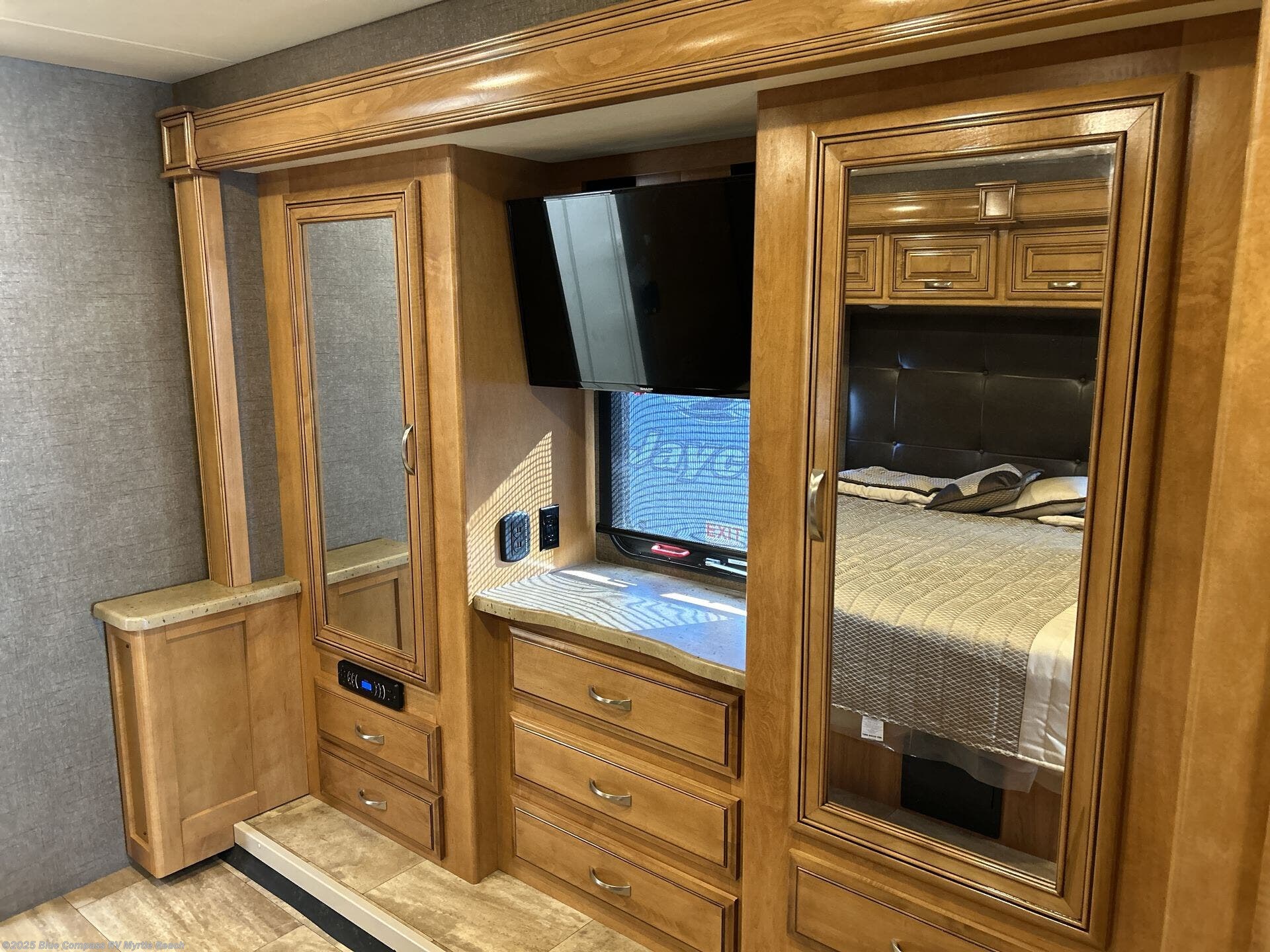 Step inside behind the passenger seat and see how spacious the interior is with the full wall slide fully extended on the road side. The slide includes a dream dinette booth for meal time, a sofa or optional theater seats, a closet that has also been prepped for a stackable washer and dryer, three additional closets, and a 32" LED TV above a dresser in the bedroom.