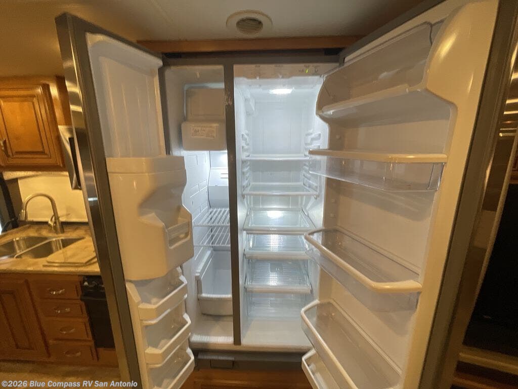 Along the door side you will find a double kitchen sink, three burner range with microwave oven above, and a residential refrigerator.