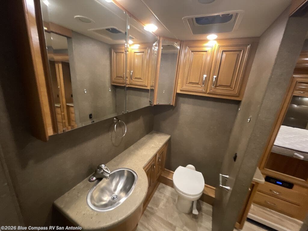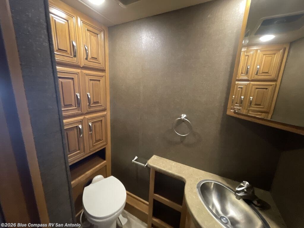 A half bath includes a toilet, linen storage, and a sink with vanity is located in the mid section of the coach. There is a 40" LED TV along the outside bathroom wall mounted above a fireplace which includes a remote.