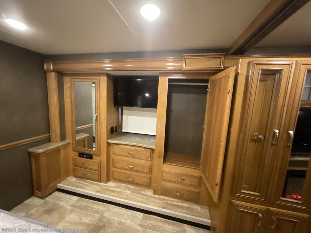 Step inside behind the passenger seat and see how spacious the interior is with the full wall slide fully extended on the road side. The slide includes a dream dinette booth for meal time, a sofa or optional theater seats, a closet that has also been prepped for a stackable washer and dryer, three additional closets, and a 32" LED TV above a dresser in the bedroom.