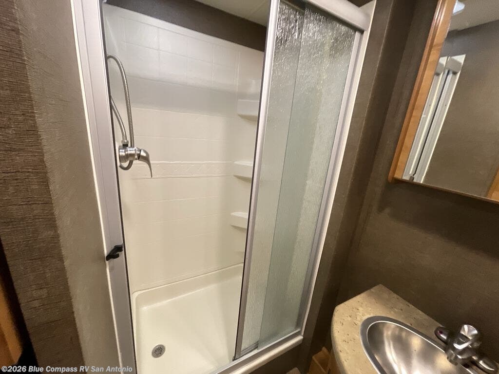 In the rear of the coach you will find a full bath with a toilet, a vanity sink, and a 36" x 30" shower.