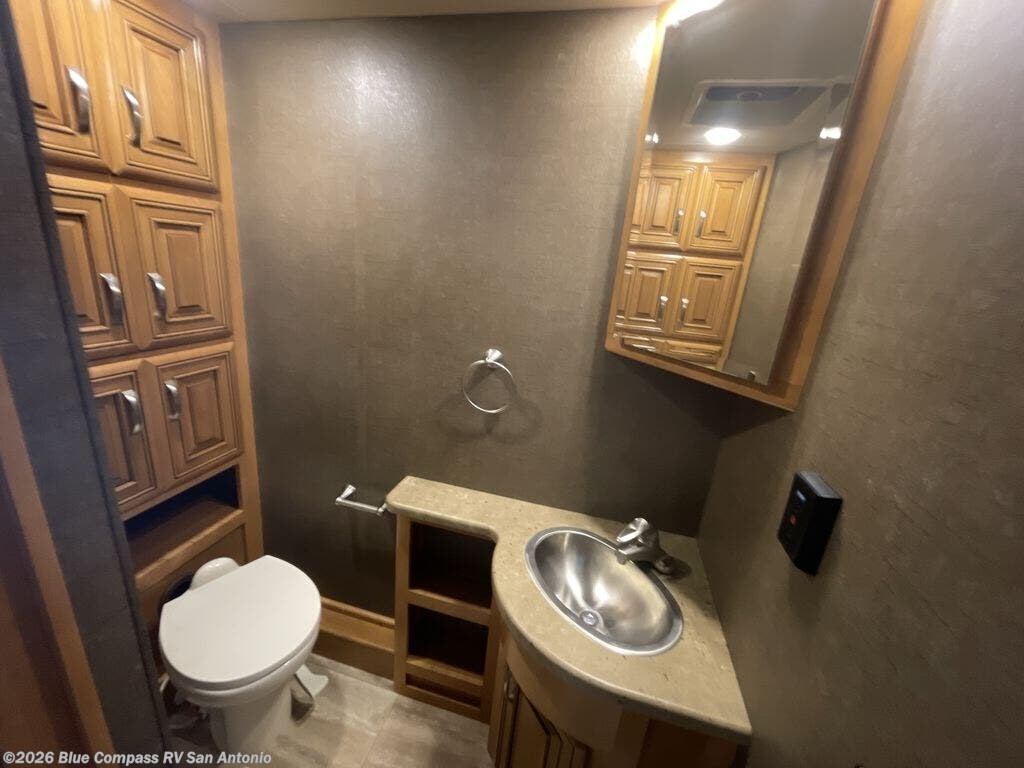 A half bath includes a toilet, linen storage, and a sink with vanity is located in the mid section of the coach. There is a 40" LED TV along the outside bathroom wall mounted above a fireplace which includes a remote.