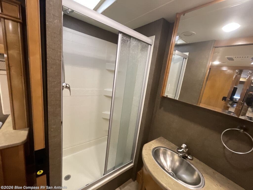 In the rear of the coach you will find a full bath with a toilet, a vanity sink, and a 36" x 30" shower.