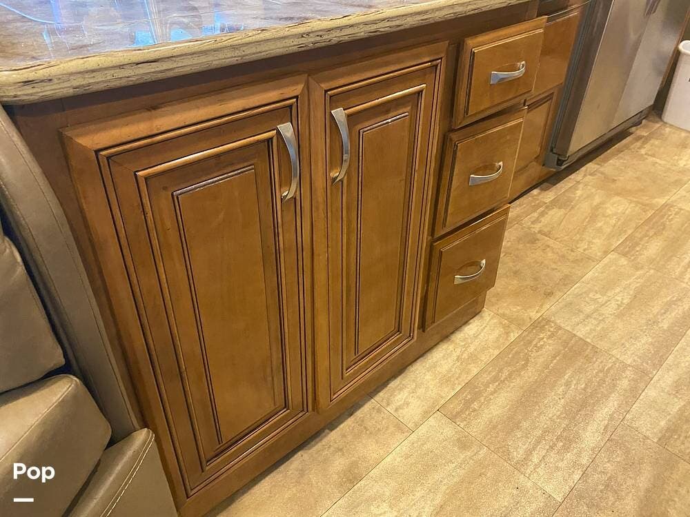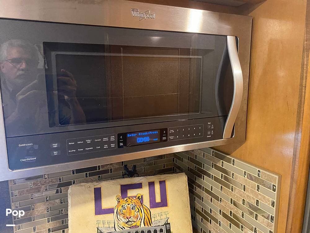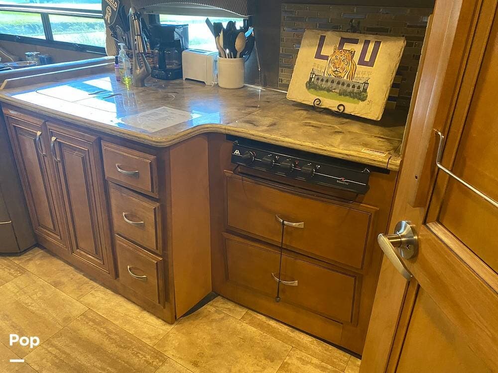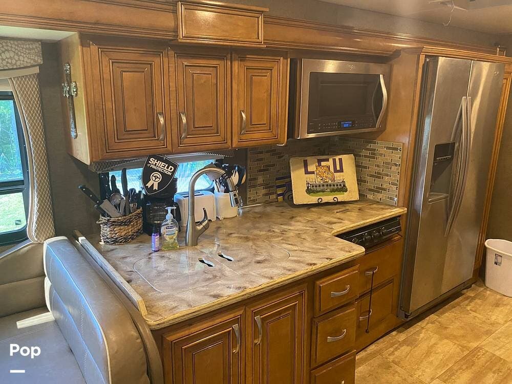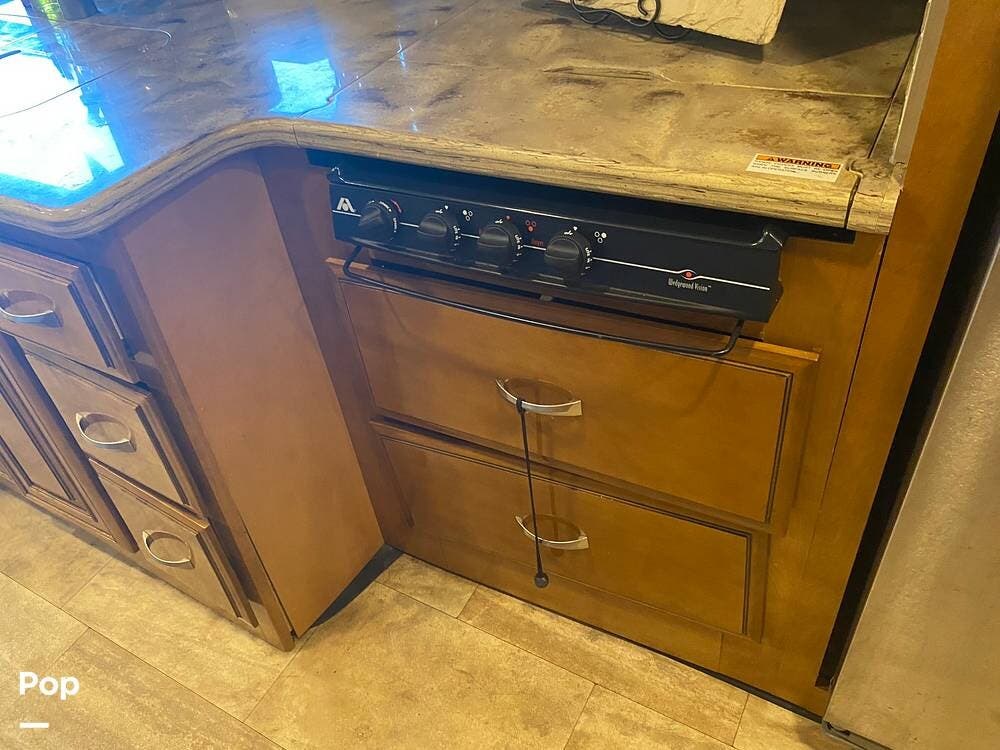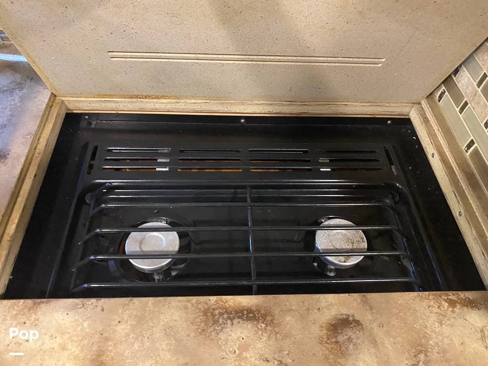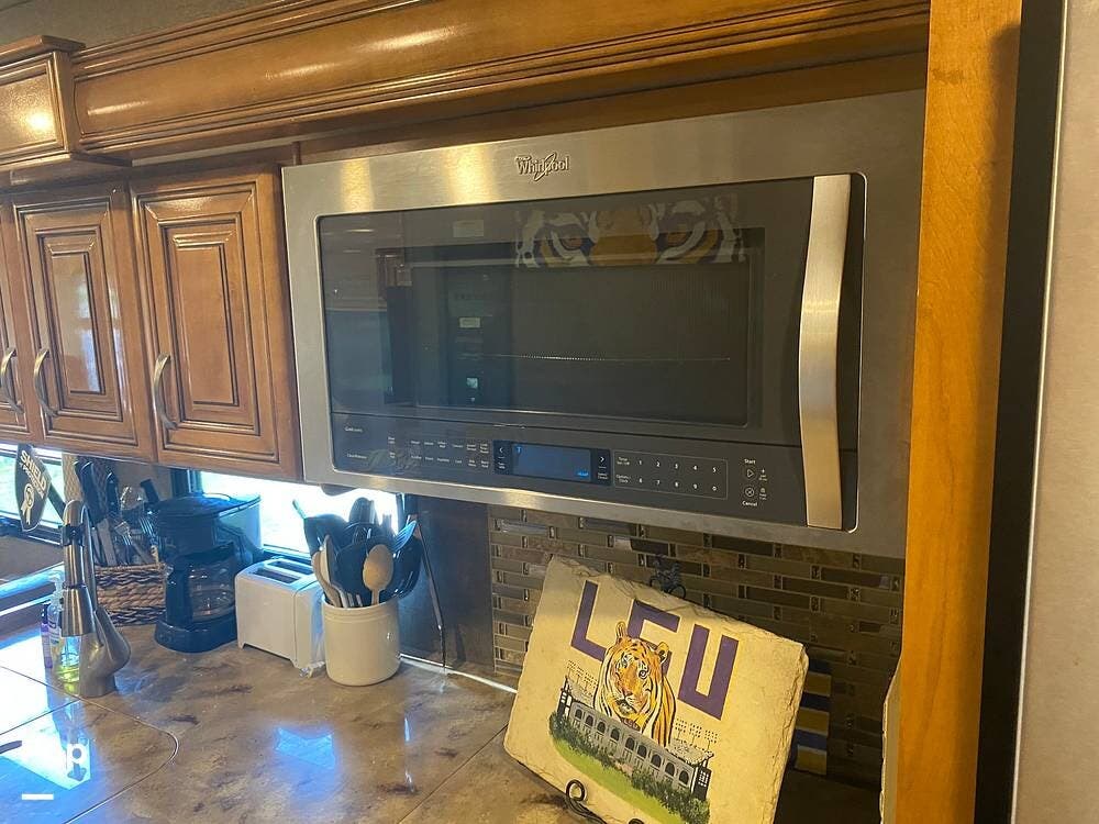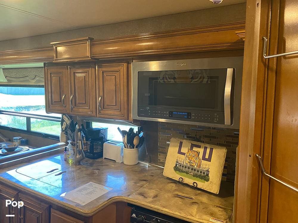With three slides extended, the unit's interior is spacious and inviting. The kitchen's layout is well thought out with efficiency in mind. Solid-surface countertop material even covers the three-burner stove. A microwave/convection oven sits conveniently above the cooktop.