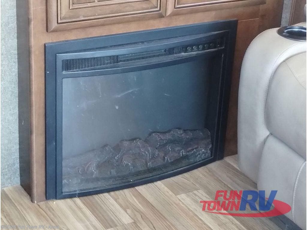 Enter just behind the front passenger seat and enjoy the space with dual slides in front fully expanded. There is a dream dinette with two sets of seat belts to your immediate left. Next, a double sink, a three burner range with overhead microwave oven, and a residential refrigerator and food pantry. Opposite find an always-in-view 40" LED TV and fireplace, plus a slide out L-shaped sofa. There is also a bunk above the cab area that drops down and provides sleeping for two.