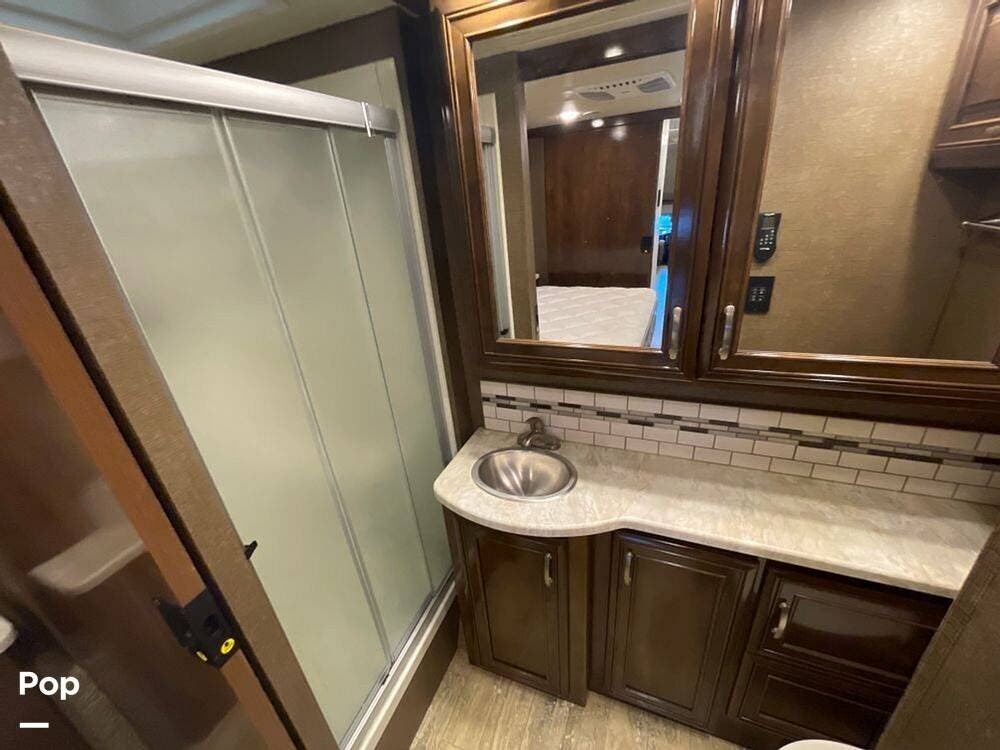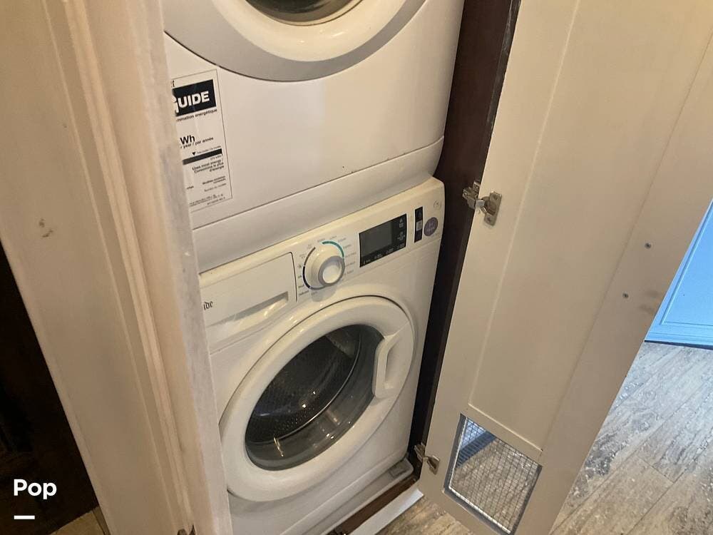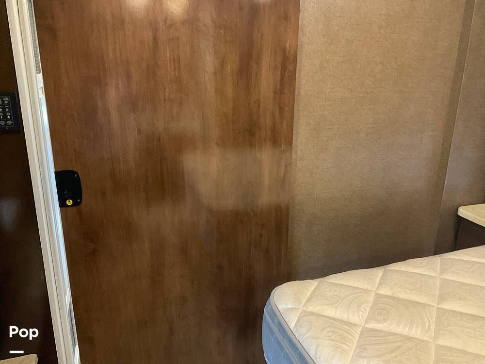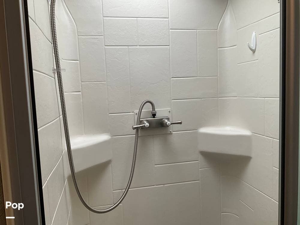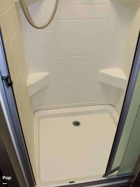 Step into the private master bedroom, where a queen bed awaits, surrounded by generous closet space. The en-suite master bath includes a 28" x 28" shower, toilet, and sink for added privacy and comfort. A 32" LED TV is mounted in the bedroom for relaxing entertainment at the end of the day.