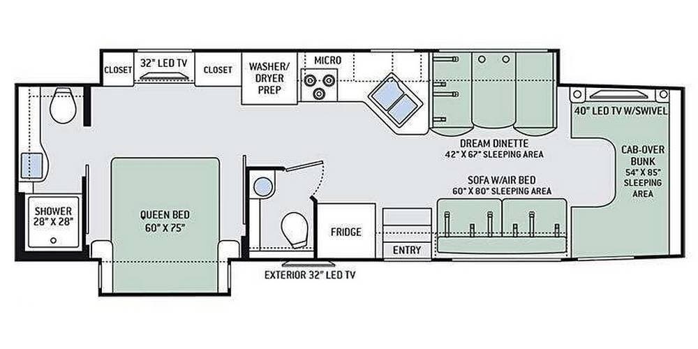 Above the cab, you'll find a spacious 54" x 85" bunk with a swivel-mounted TV for comfortable viewing from multiple angles.