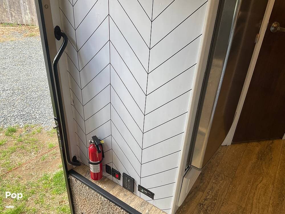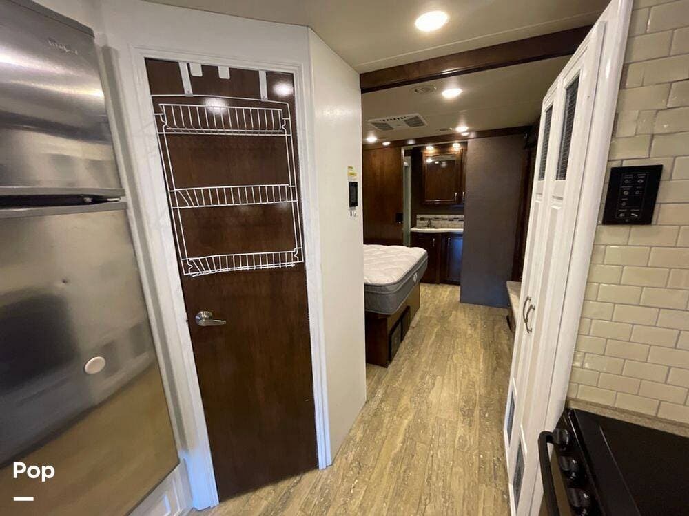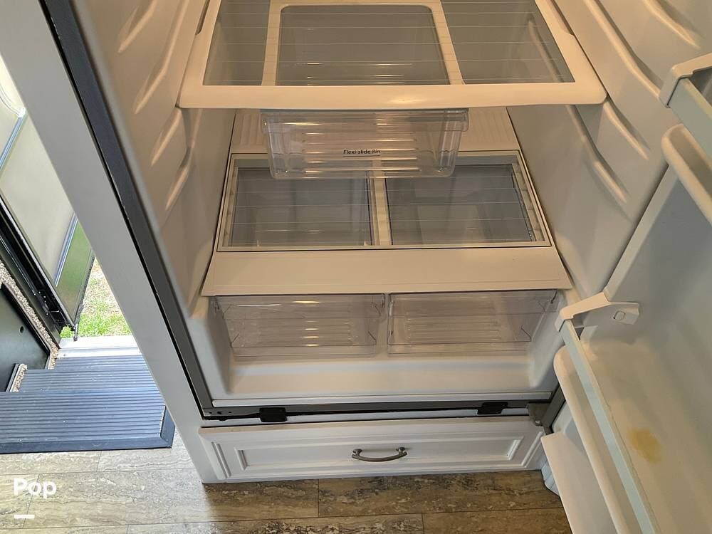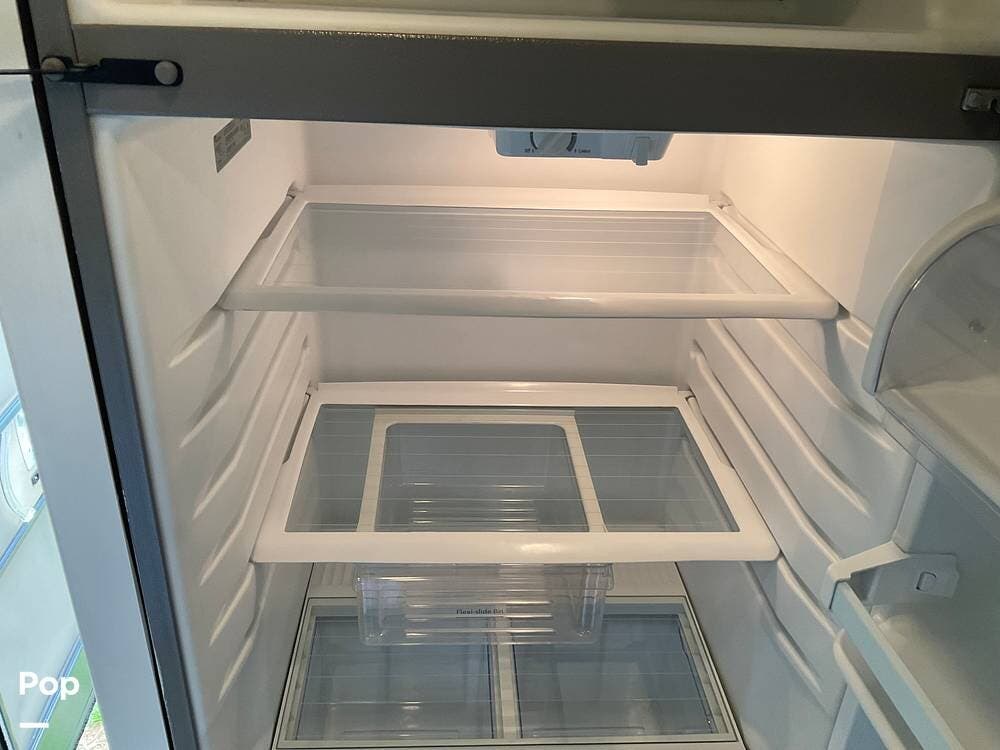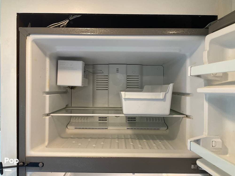 To the left of the entry, the kitchen and convenience features begin. A full-size refrigerator and freezer provide ample food storage, while a nearby half bath with toilet and sink offers quick cleanup after a long day of adventure or racing.
