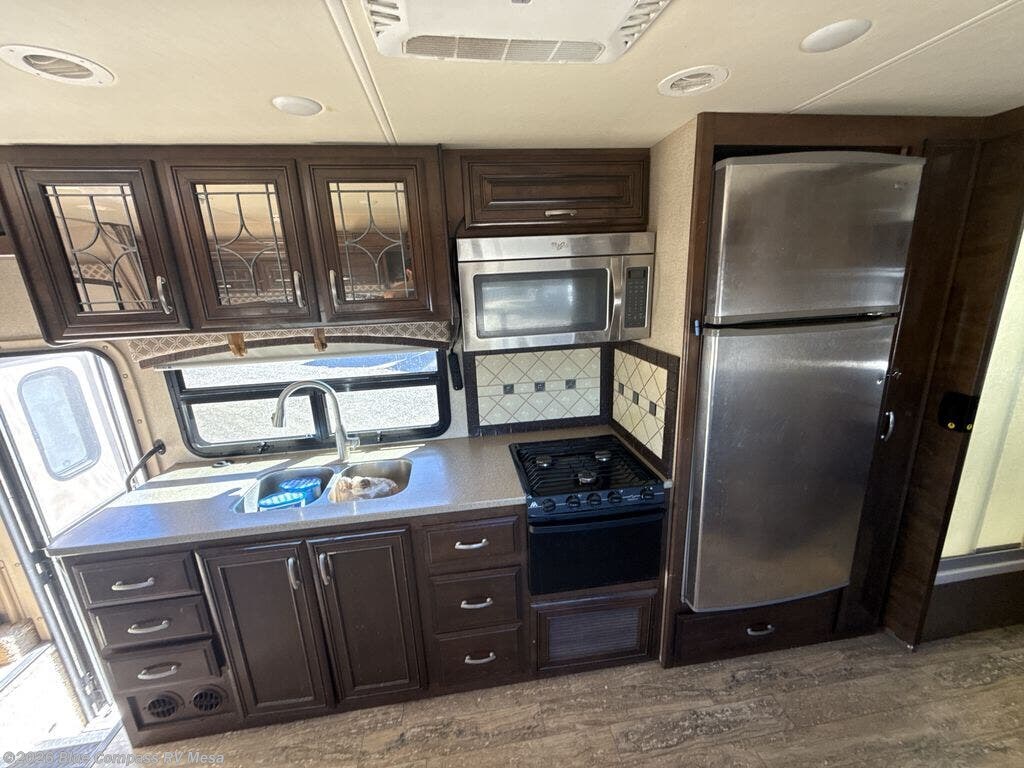 To your left the kitchen amenities include a double sink, three burner range with microwave above, a residential refrigerator, and a pull-out pantry. There are overhead cabinets for your dishes and things, plus counter space for preparing and serving meals.