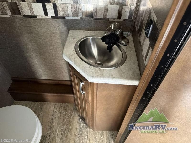 There is a half bath next to the refrigerator that includes a toilet and vanity with sink, plus storage.