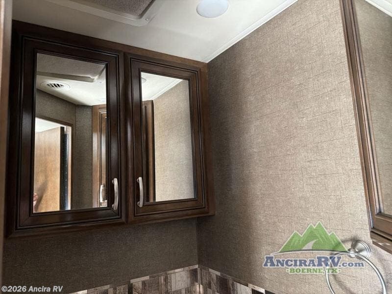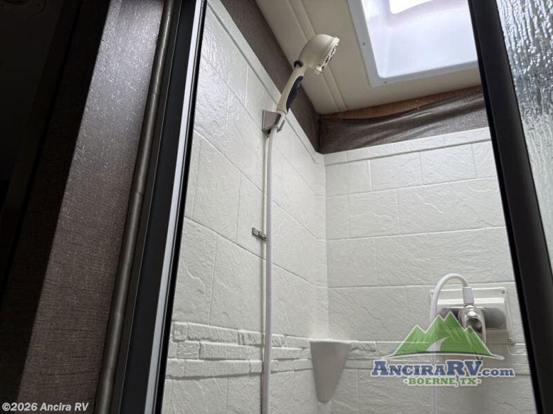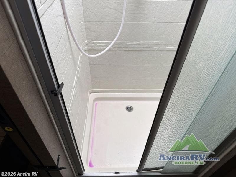 The rear full bath offers a 28" x 28" shower, long vanity with sink and overhead storage, plus a toilet.