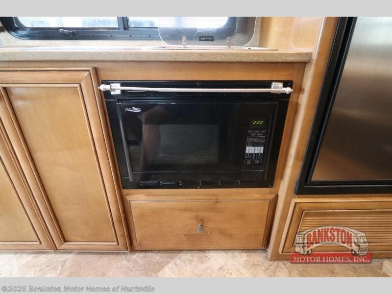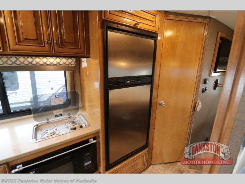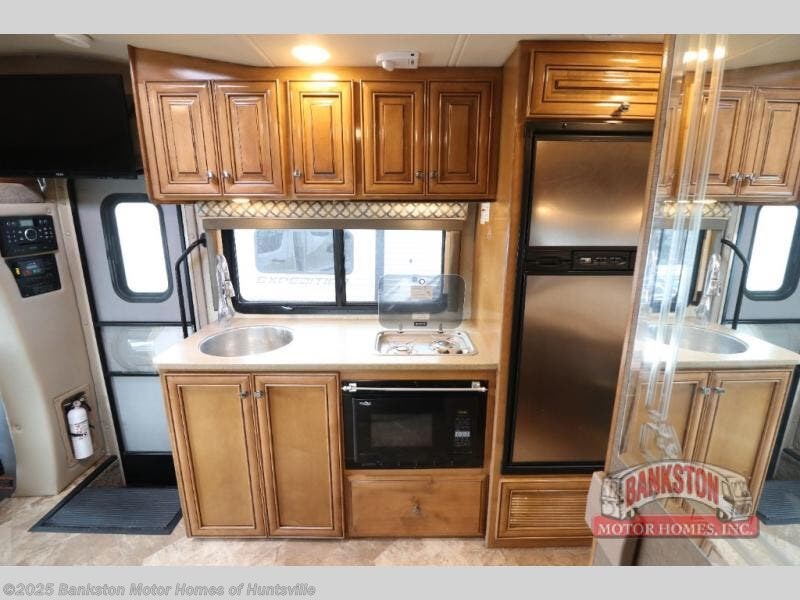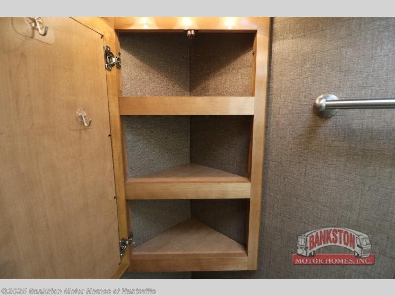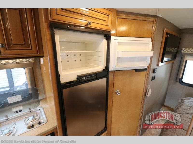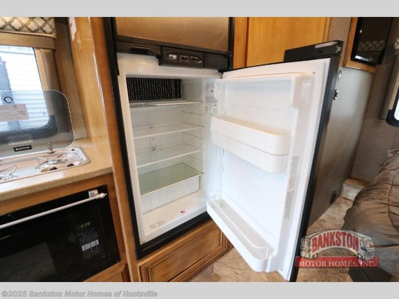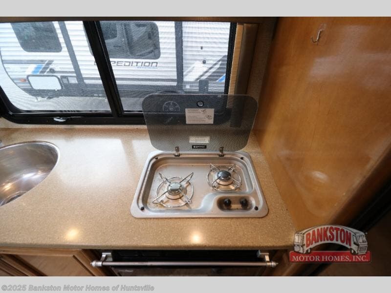 Model 24SS offers double slides, a rear corner bath, and cab-over bunk for an added 36" x 75" sleeping space. Enter just behind the front passenger seat and notice the 32" LED TV overhead. To your immediate left there is a kitchenette that will allow you to easily make meals and snacks on the road. There is a round single sink, some counter space, and a two burner range top, plus overhead microwave oven. There is also a refrigerator for your perishables.