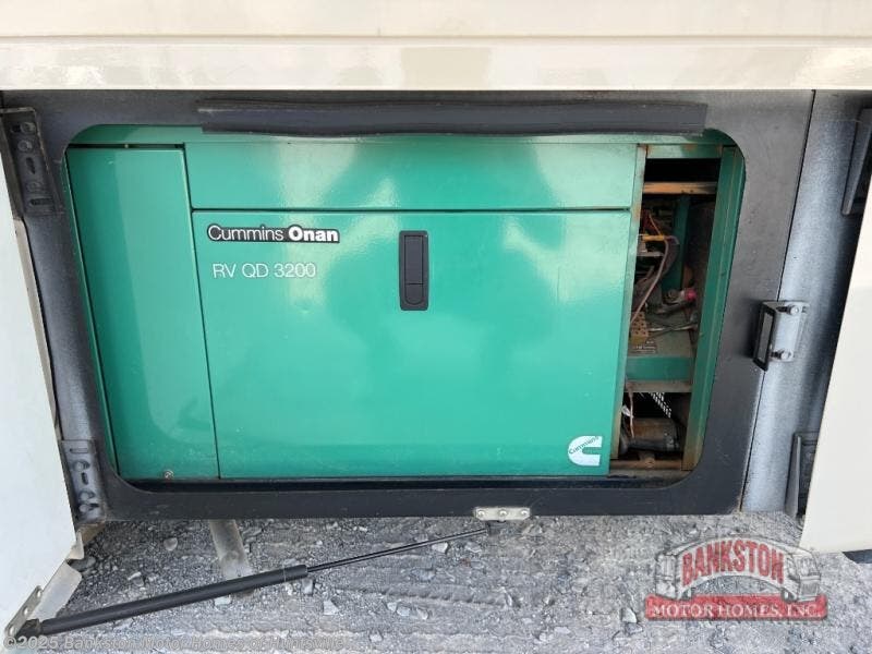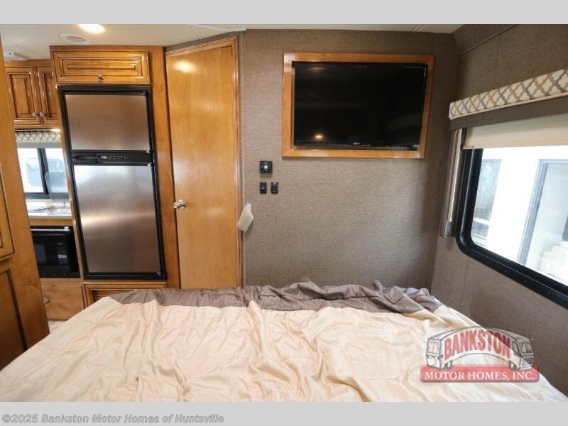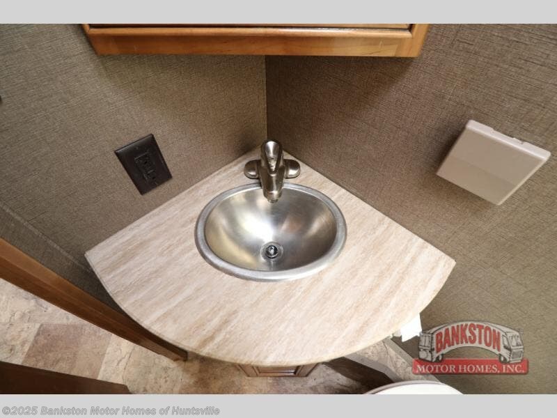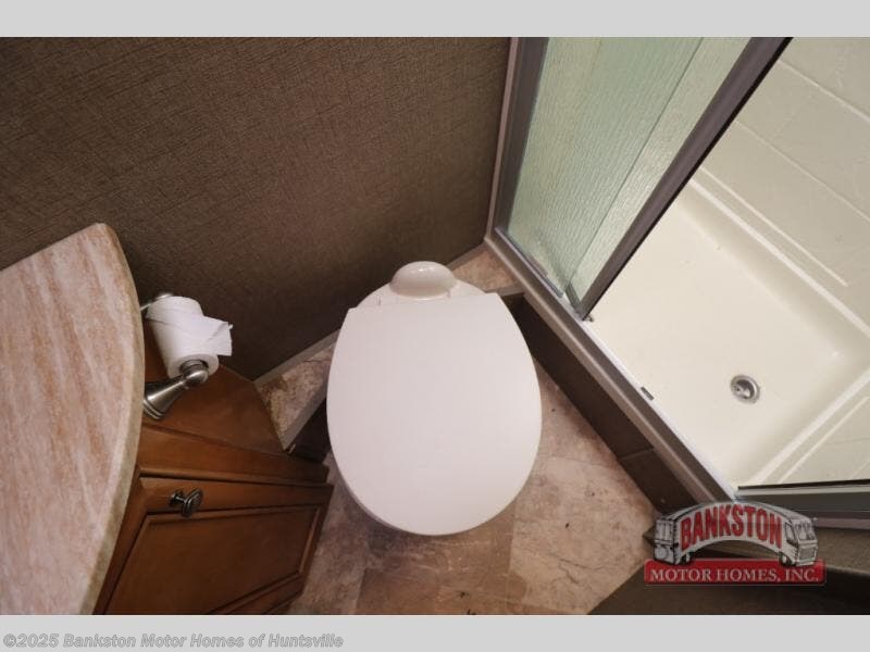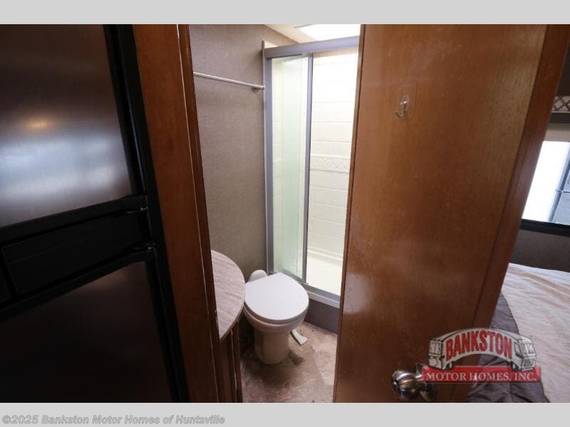 A rear corner bath features a 24" x 32" shower, toilet, and vanity with sink, plus overhead medicine cabinet. The opposite corner features a queen size bed slide out on the road side plus a nightstand and more overhead cabinets. There is a 32" LED TV, and more.