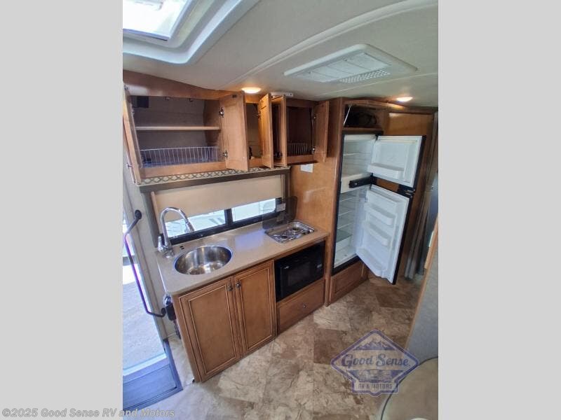 Model 24SS offers double slides, a rear corner bath, and cab-over bunk for an added 36" x 75" sleeping space. Enter just behind the front passenger seat and notice the 32" LED TV overhead. To your immediate left there is a kitchenette that will allow you to easily make meals and snacks on the road. There is a round single sink, some counter space, and a two burner range top, plus overhead microwave oven. There is also a refrigerator for your perishables.