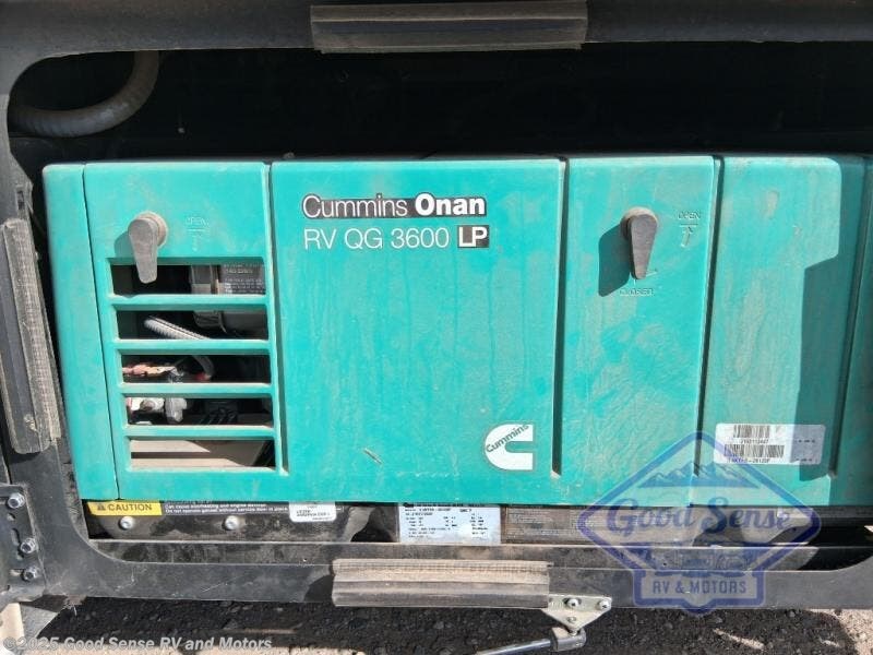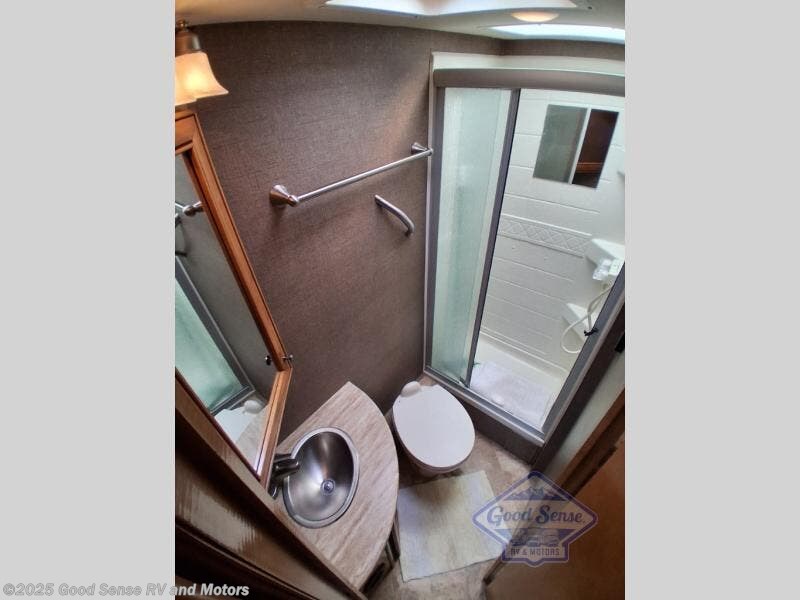 A rear corner bath features a 24" x 32" shower, toilet, and vanity with sink, plus overhead medicine cabinet. The opposite corner features a queen size bed slide out on the road side plus a nightstand and more overhead cabinets. There is a 32" LED TV, and more.