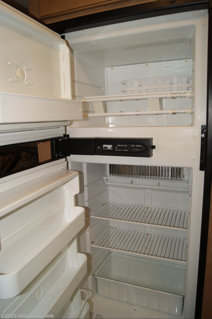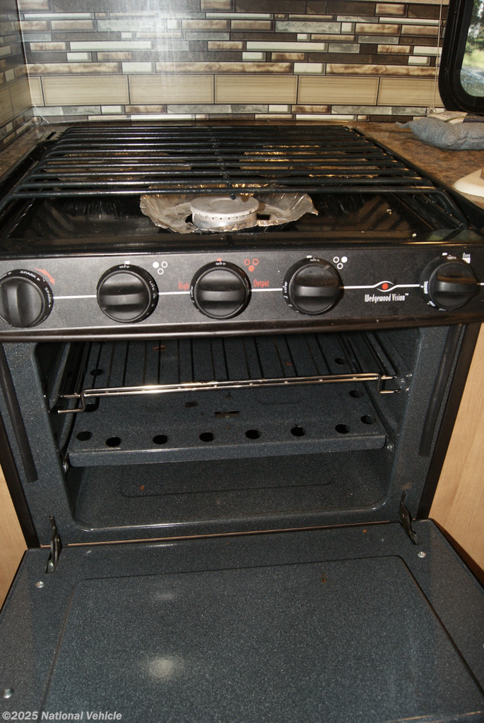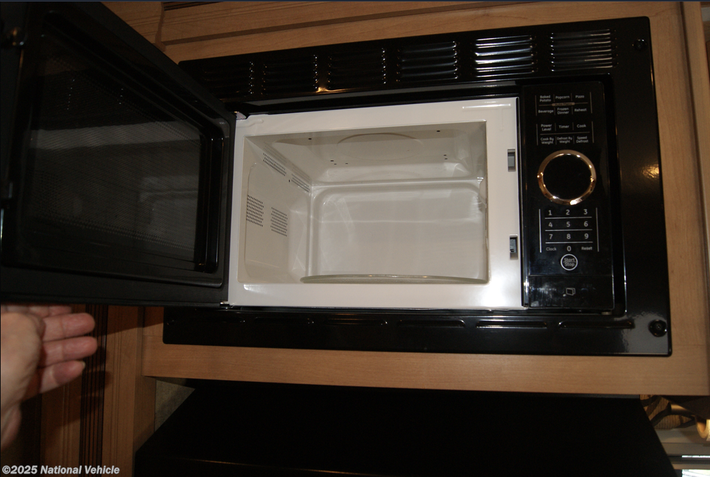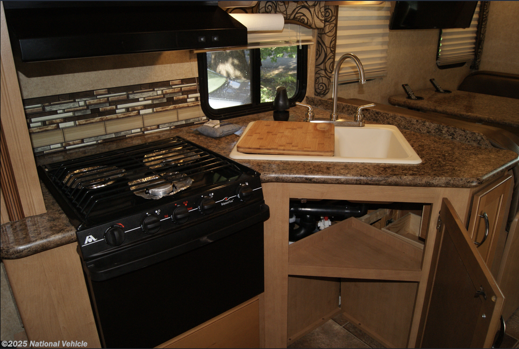 Kitchen: The galley is fully equipped with a microwave, 3-burner cooktop, sink, refrigerator, and overhead cabinets, giving you everything needed to cook meals on the road.