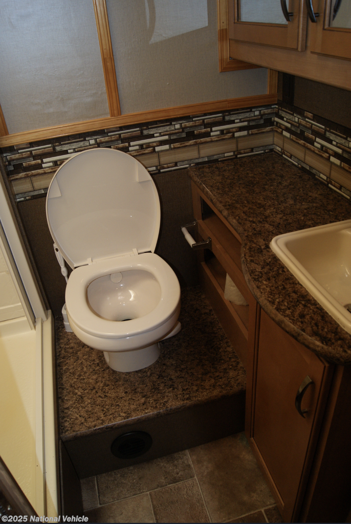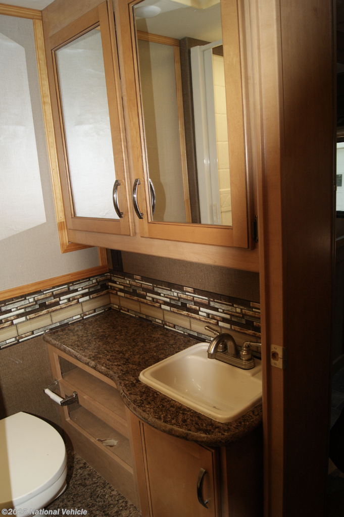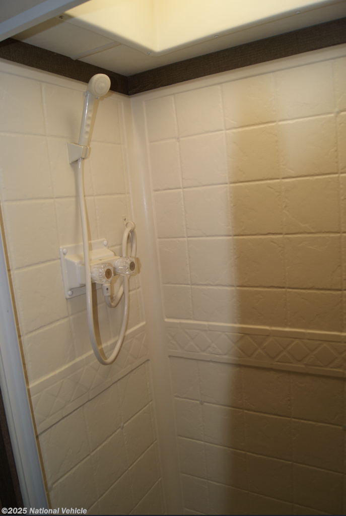 Bathroom: A mid-coach bathroom features a 24" x 36" shower, toilet, and vanity, conveniently located for access from both the living area and bedroom.