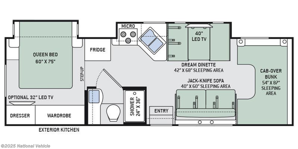 Sleeping Options: Up front, a spacious cab-over bunk (54" x 87") offers dedicated sleeping space, while the Dream Dinette (42" x 68") and Jack-Knife Sofa (40" x 60") easily convert to beds. In the rear, a private queen bed (60" x 75") with wardrobe and dresser provides a comfortable retreat. Altogether, the coach sleeps up to 8 people.