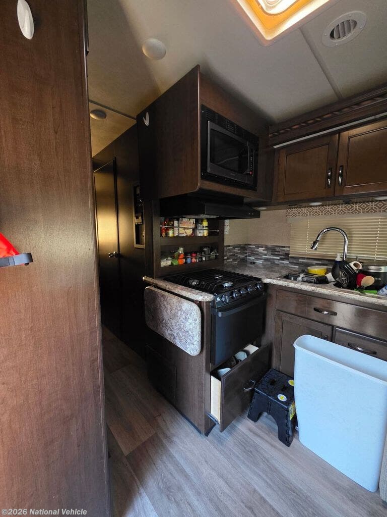 As you enter this model you will love the extra floor space thanks to the slide out along the roadside. Within the slide out you will find a 68" jack-knife sofa, a sink, plus a large overhead cabinet. Along the interior wall there is a three burner range, a microwave, and a flip-up counter top. To the left of the entry door you will find a refrigerator. Enjoy your meals at the 71" Dream Dinette, and at night this area easily converts into additional sleeping space.