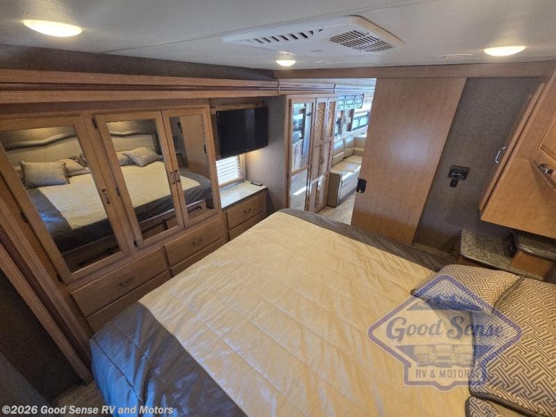 Continuing into the rear bedroom, the slide out offers an additional wardrobe, and a dresser with a 32" LED TV. The bedroom also includes a king size bed with nightstands on each side and overhead storage above the head of the bed.