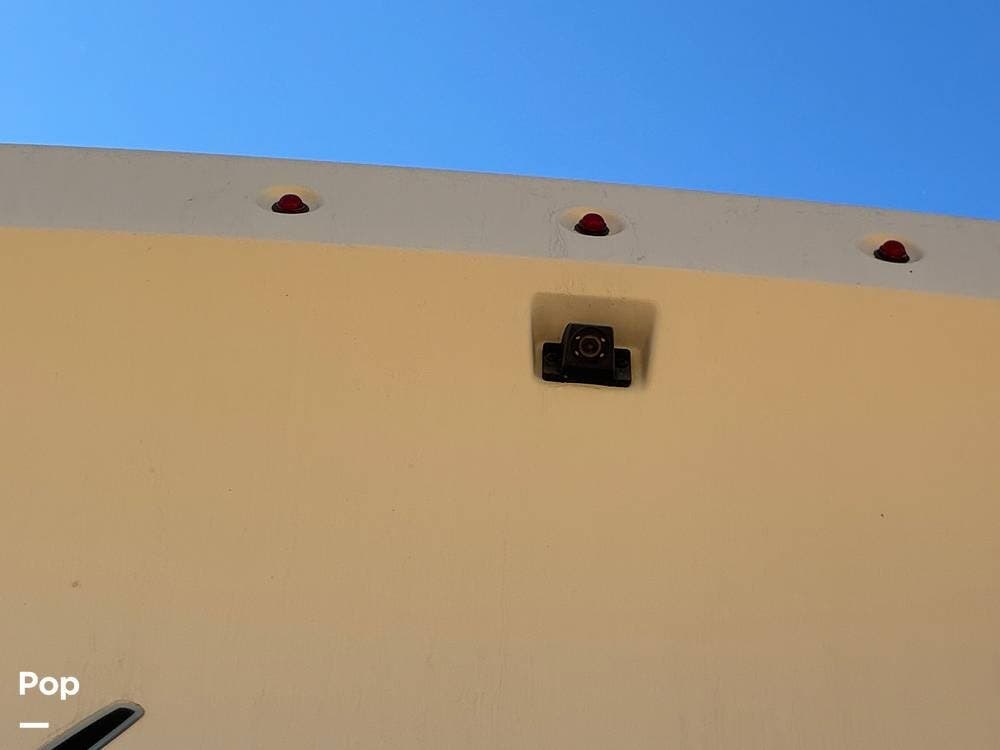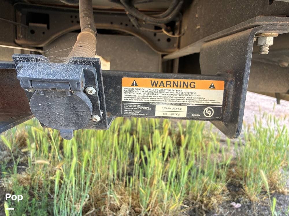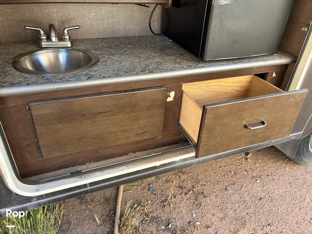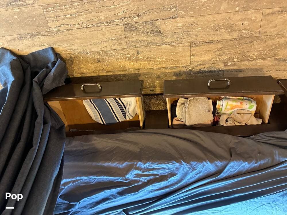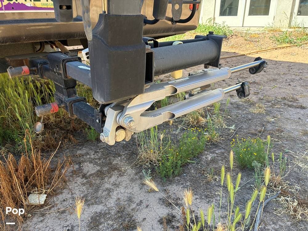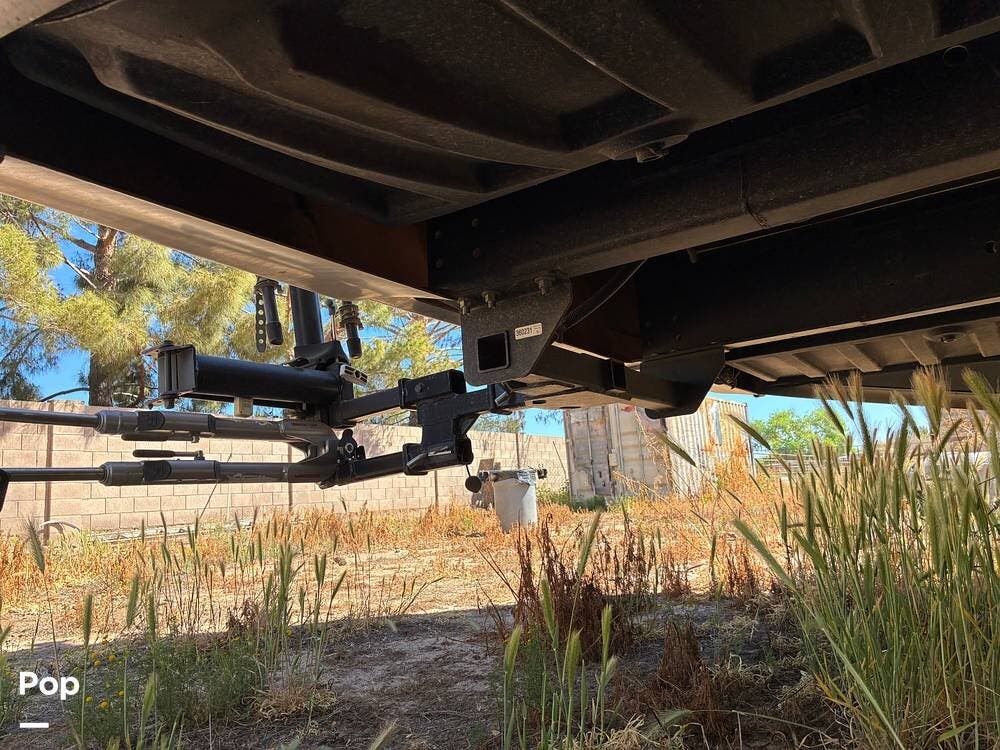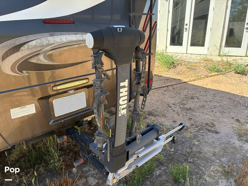 Outside, you'll find an exterior kitchen with a mini fridge, patio awning, and large pass-through storage compartments. This unit also includes additional gear such as a tow setup and bike rack, adding extra value for the next owner.