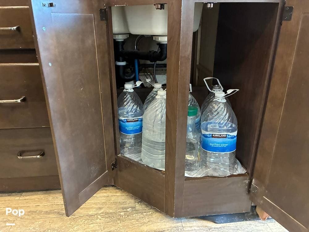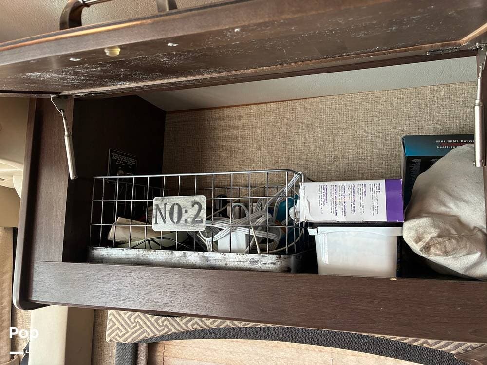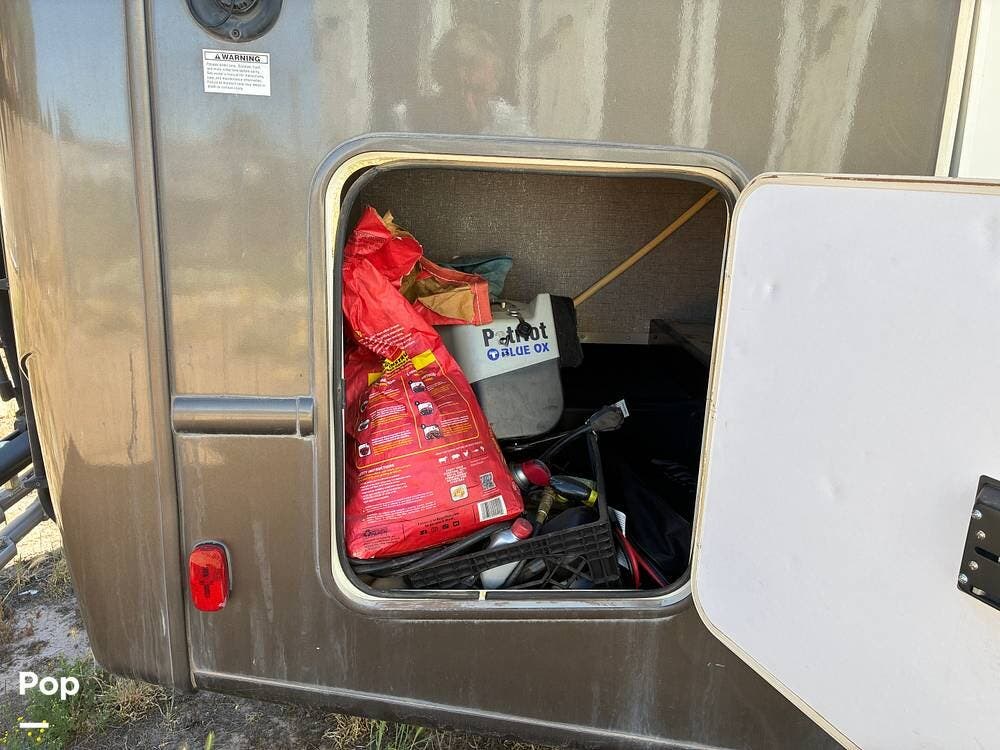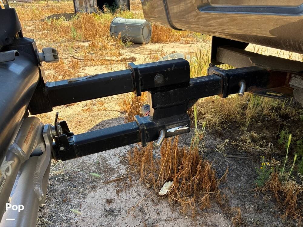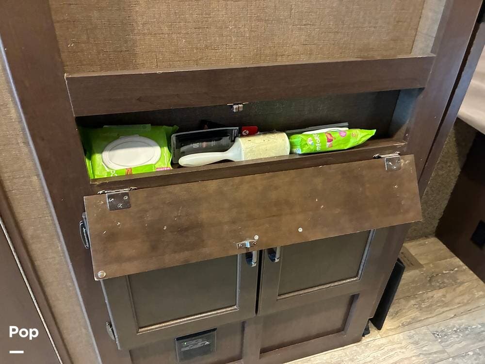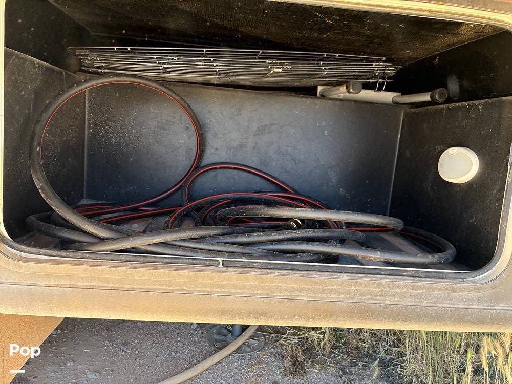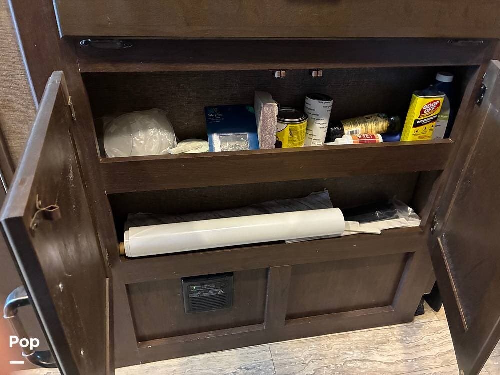 Outside, you'll find an exterior kitchen with a mini fridge, patio awning, and large pass-through storage compartments. This unit also includes additional gear such as a tow setup and bike rack, adding extra value for the next owner.