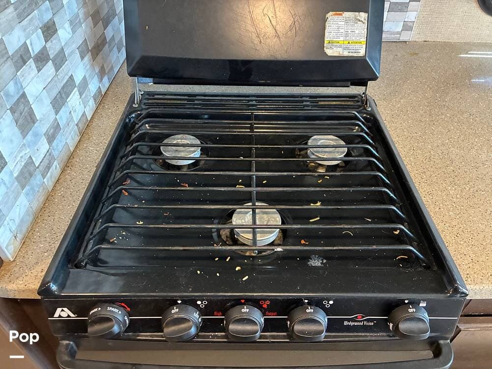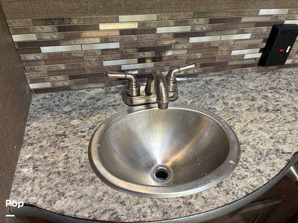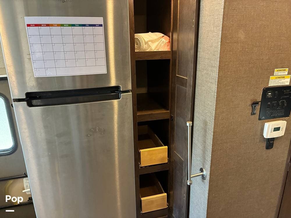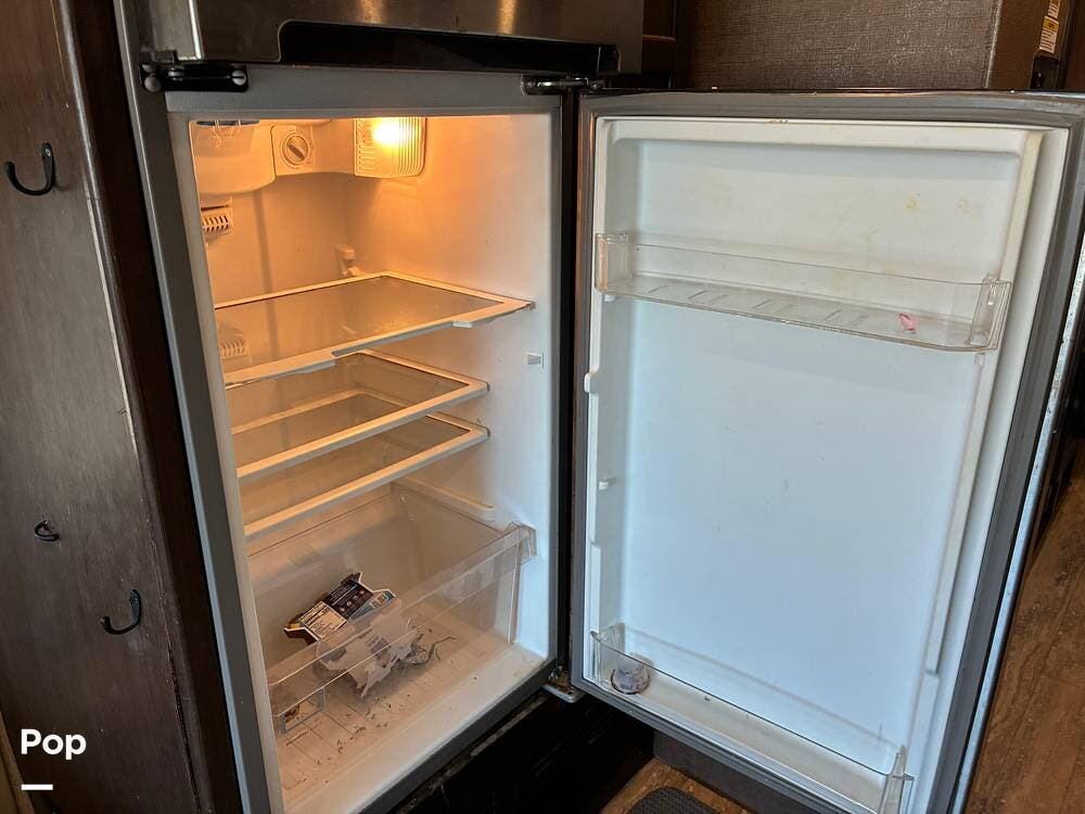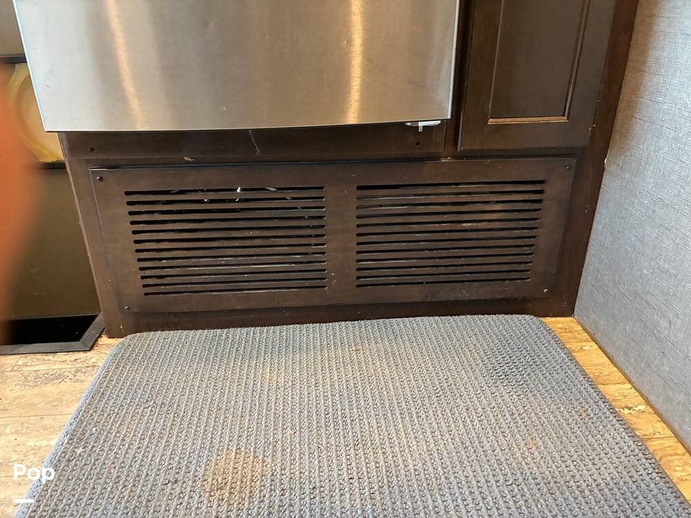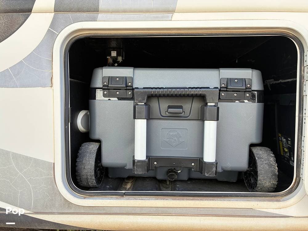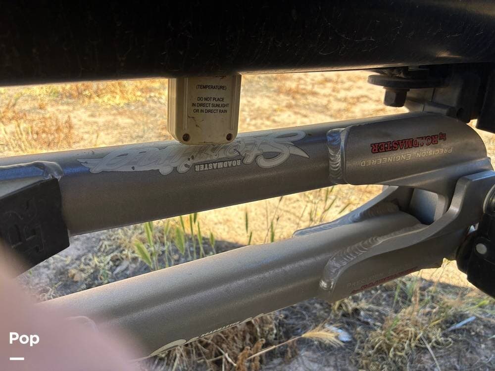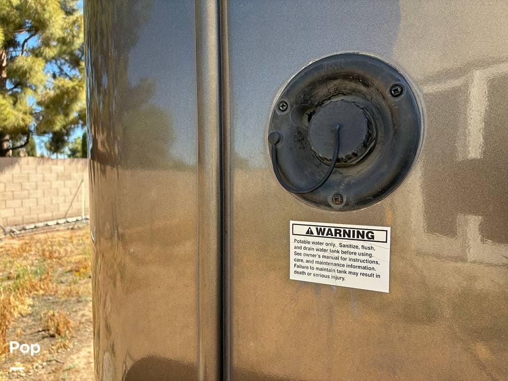 Outside, you'll find an exterior kitchen with a mini fridge, patio awning, and large pass-through storage compartments. This unit also includes additional gear such as a tow setup and bike rack, adding extra value for the next owner.