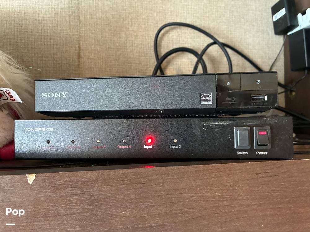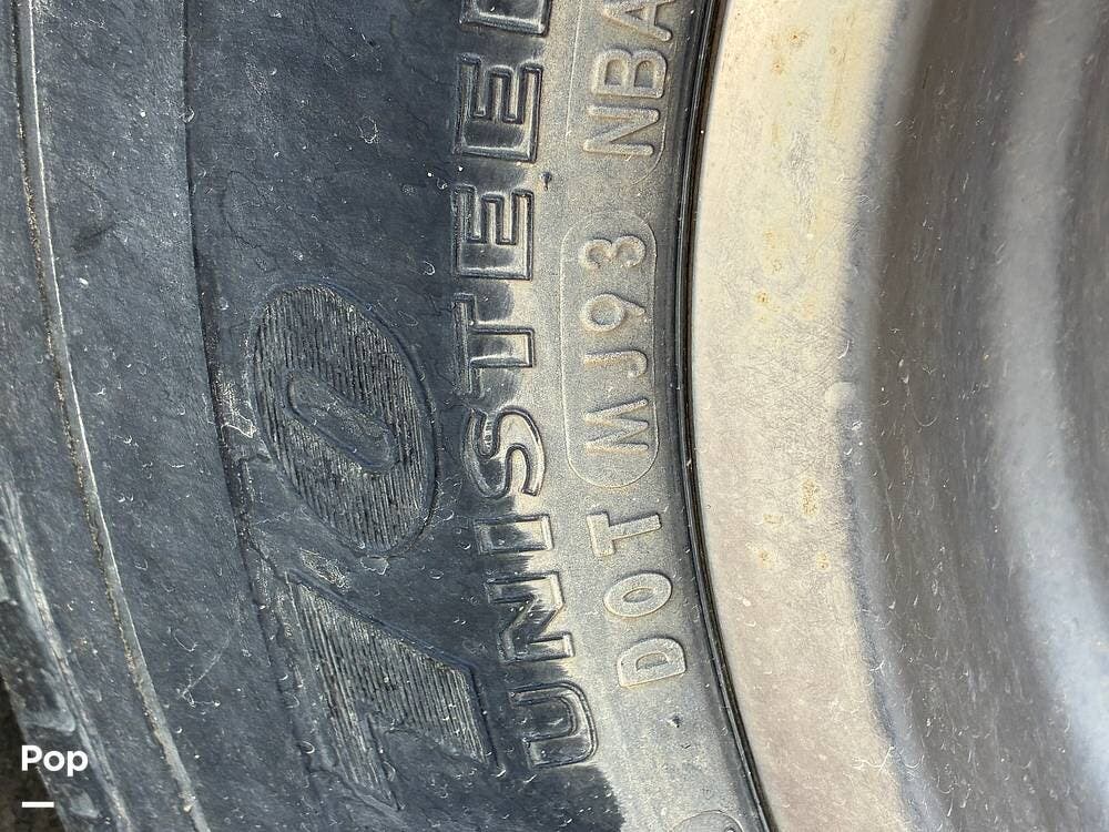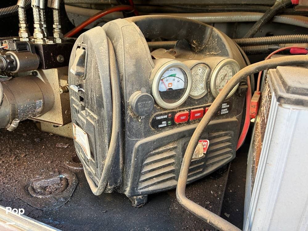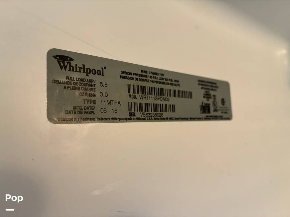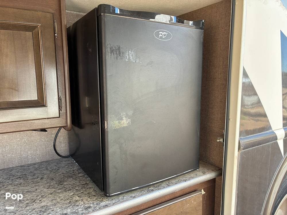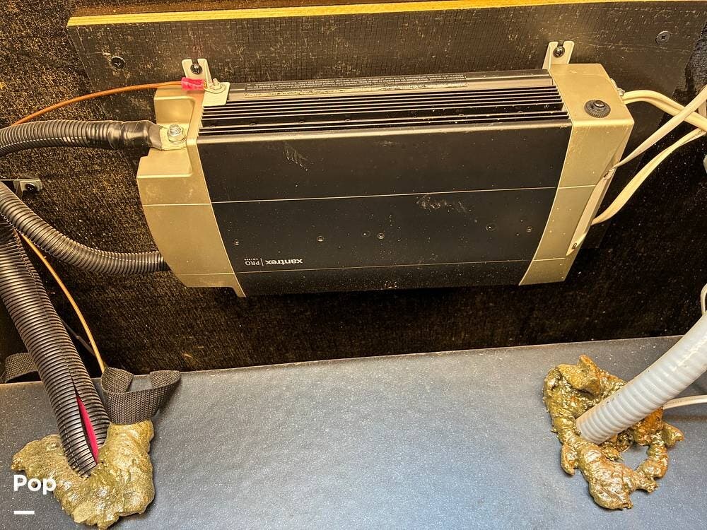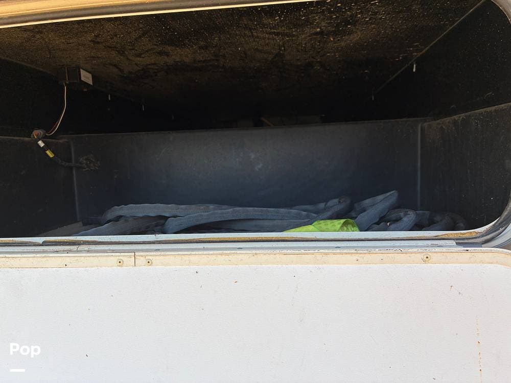 Outside, you'll find an exterior kitchen with a mini fridge, patio awning, and large pass-through storage compartments. This unit also includes additional gear such as a tow setup and bike rack, adding extra value for the next owner.