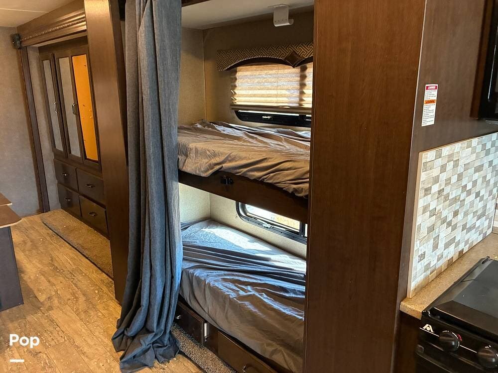 Inside, the popular 34J bunkhouse floorplan offers a versatile layout ideal for families or groups. The rear bedroom features a king-size bed with surrounding storage, while the hallway bunk beds provide dedicated sleeping space for kids or guests. Up front, additional sleeping areas include a convertible dinette, a sofa, and an overhead bunk, allowing this coach to sleep up to 10.