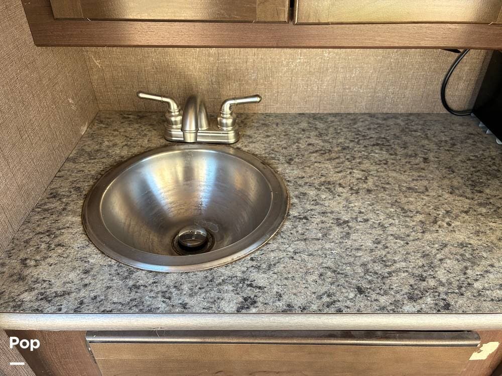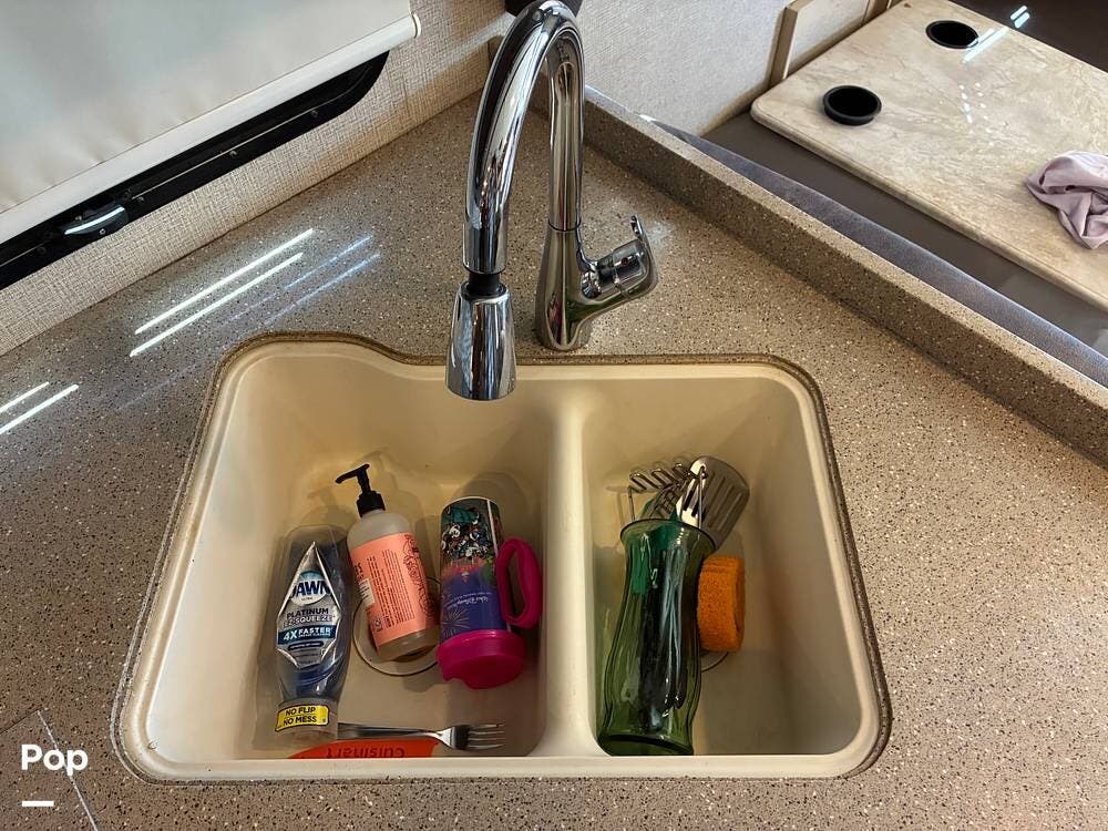 The living area flows well with a full-wall slide that opens up the interior, creating a comfortable space for relaxing or entertaining. The kitchen includes a three-burner stove, microwave, double sink, and ample cabinetry, making meal prep easy whether you're on the road or parked for a while.