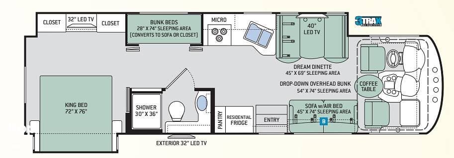 Convertible bunkhouse! You can accommodate the family or grandkids with bunks in position. When converted, the bunks can fold into a sofa or large closet for full-time RV cruisers.