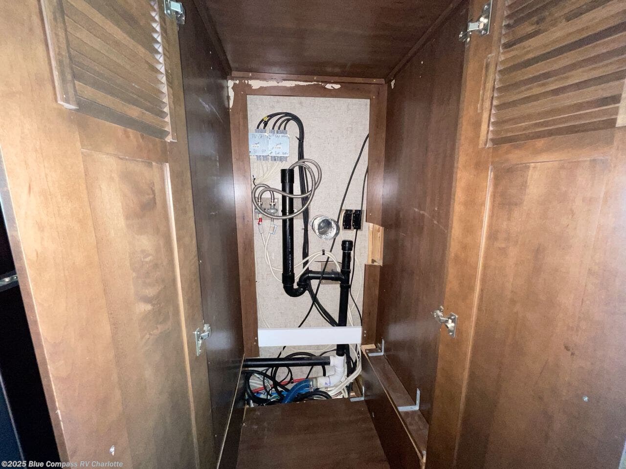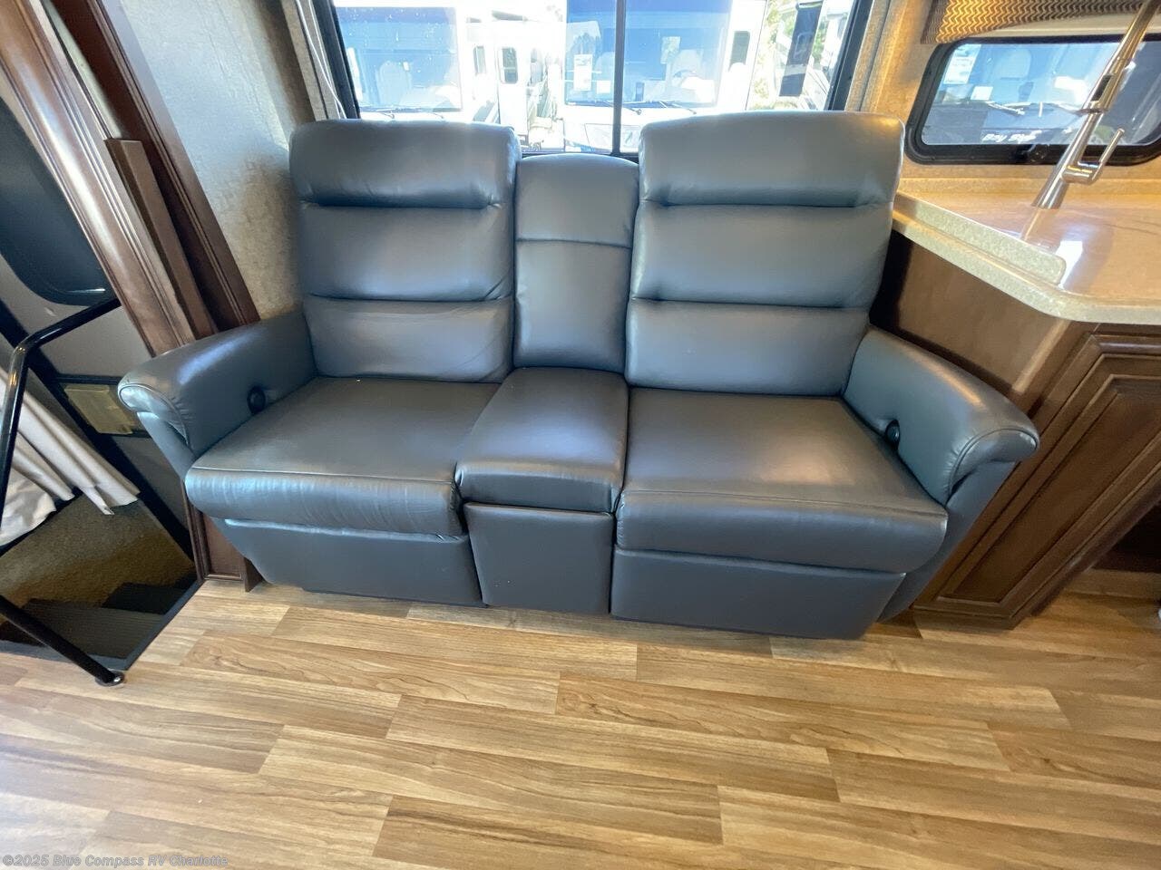 As you step inside you will see the full wall slide to your left allowing more walking around room from the entry door to the rear bedroom in this coach. First, within the slide there is theater seating for two, a double kitchen sink, three burner range with microwave oven, a residential refrigerator, and a pantry for your non-perishables. Plus there is a closet prepped for a washer and dryer in the hallway, including a 32" LED TV, dresser, and wardrobe in the bedroom.