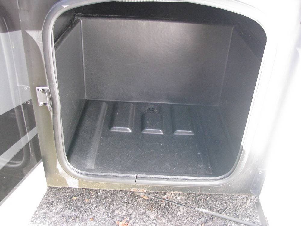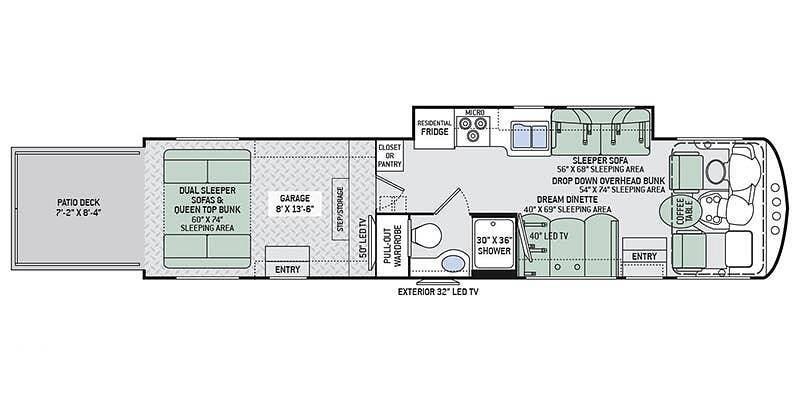 The layout has two access doors one for the front and one for the garage area. The garage has plenty of room and storage as well and is 8' X 13-6" X 101" TALL. It has cabinets and an electric bed overhead and the rear fold down door ramp makes into a nice patio area. The garage also has a small window a/c and heat unit as well as the two rooftop a/c units and of course you have the front dash a/c.