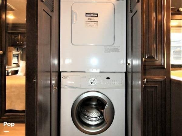Multiple LED TVs, including an exterior 32" TV for outdoor viewing, provide entertainment options. The coach is also equipped with a 6,000-watt Onan diesel generator, dual roof-mounted air conditioners, and a 10,000-pound trailer hitch, making it as practical as it is luxurious.