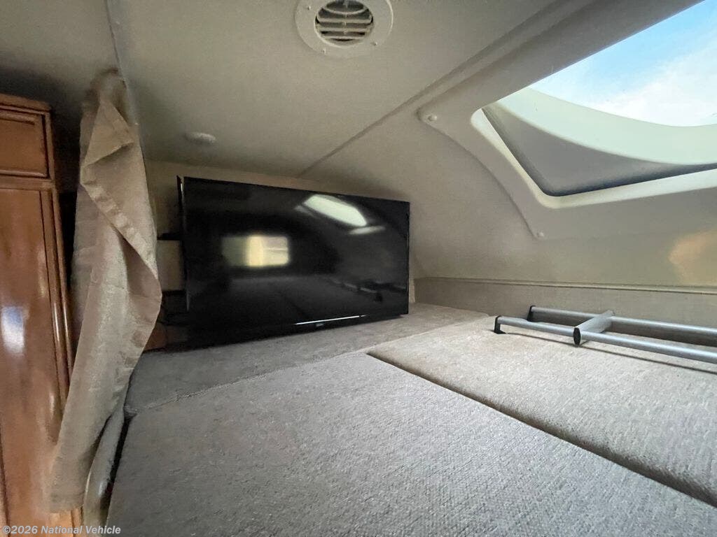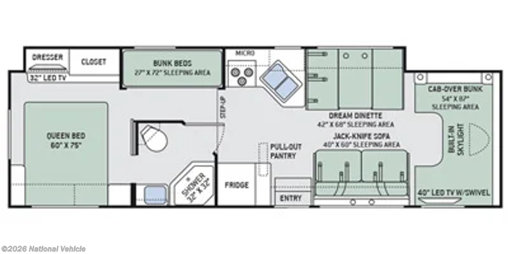 Enter mid coach along the curb side and see just how convenient traveling can be. There is a jack-knife sofa with 40" x 60" sleeping area if needed to your right. An over the cab bunk with built-in skylight features a 54" x 87" sleeping space, plus also features a 40" LED TV with swivel base.