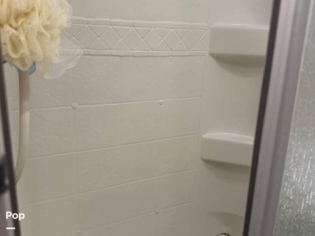 A mid coach full bath typically features a shower, toilet, and vanity with a sink. A sliding door separates the rear master bedroom from the kitchen and bath area.