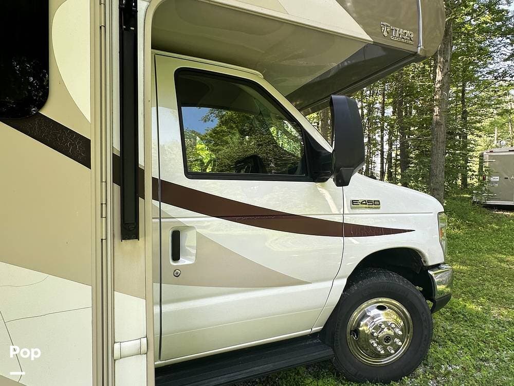 This is a 2017 Quantum PD31 Class C motorhome by Thor. It is powered by a Ford 6.8-liter gas motor and automatic transmission. It has just 19,300 miles on the clock.