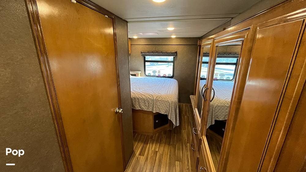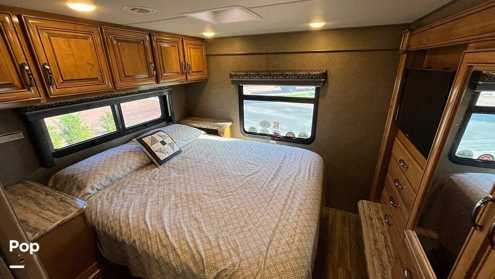 The rear bedroom offers privacy and comfort with a walk-around camper Queen bed, ample wardrobe storage, and its own TV.