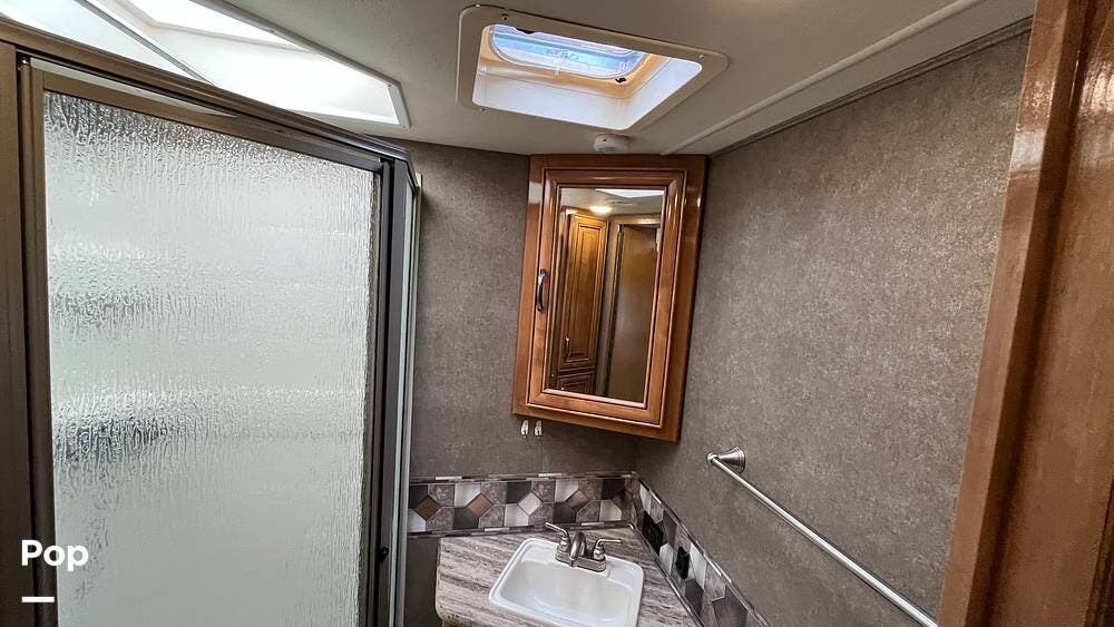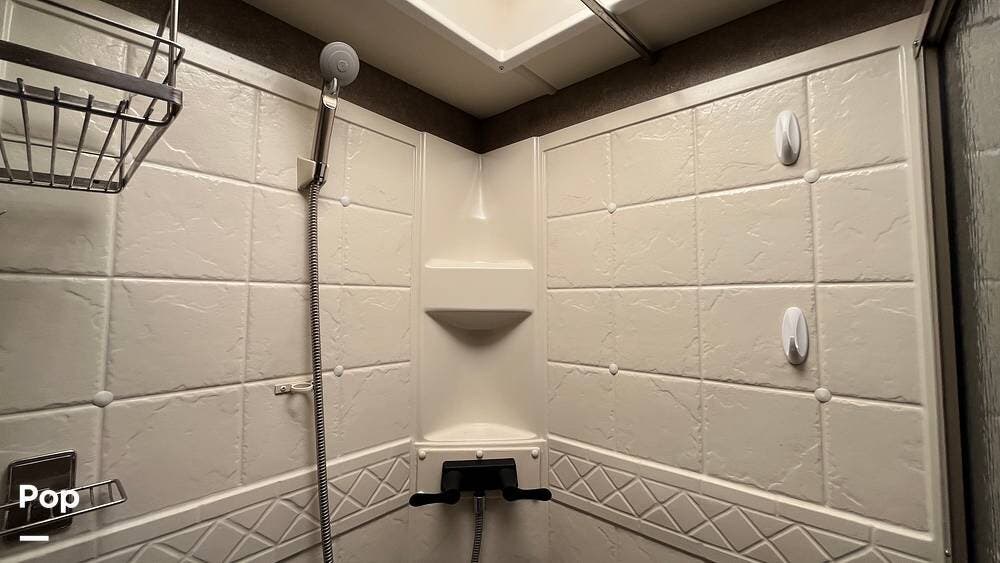The bathroom features a roomy shower, skylight, and plenty of storage.