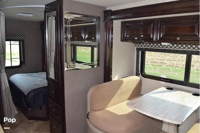 The living area has comfortable seating and a 32-inch LED TV for entertainment. The "Dream Dinette" features a slide that expands the living area and provides booth seating. A skylight allows ample daylight and fresh air to vent.