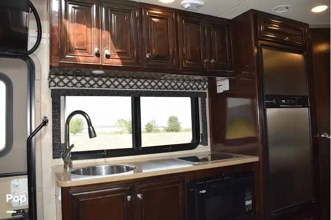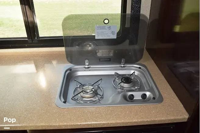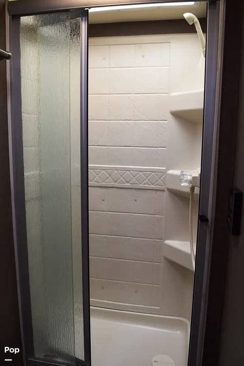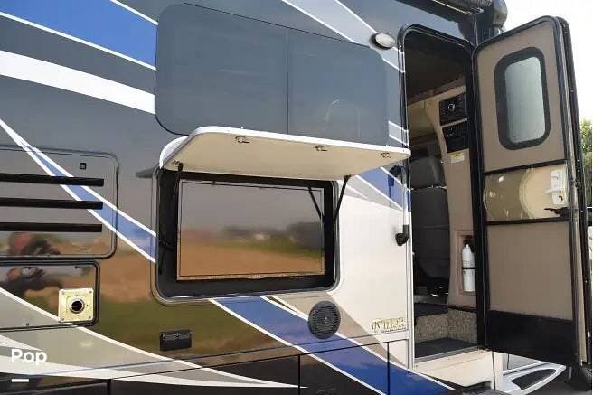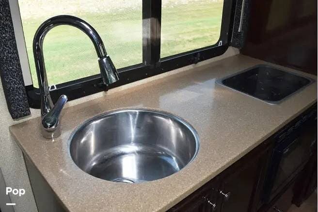 There is a 5,000-pound trailer hitch with a seven-pin plug. An outside shower and a black tank flush system are available to ensure cleanliness. Each holding tank is equipped with heating elements to prevent freezing.