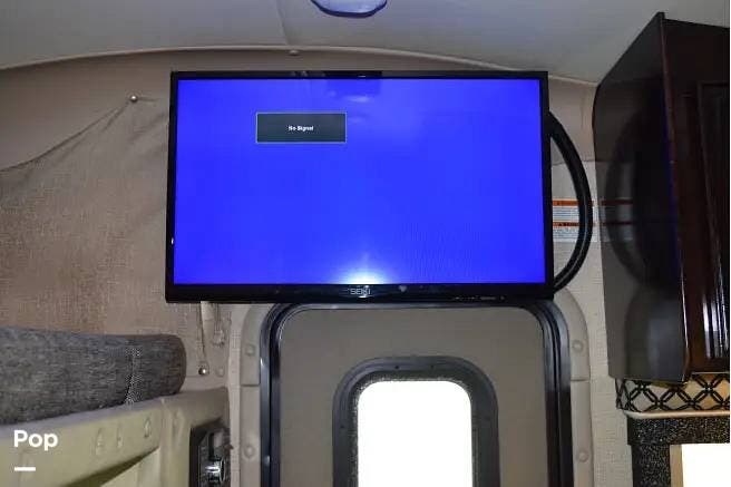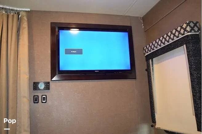 The bedroom offers a cozy retreat with a comfortable queen bed, a wall-mounted 32-inch LED TV, and plenty of storage space. The bedroom features a second slide to expand the bedroom area.