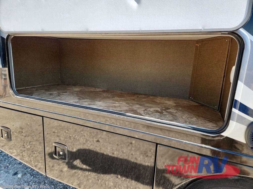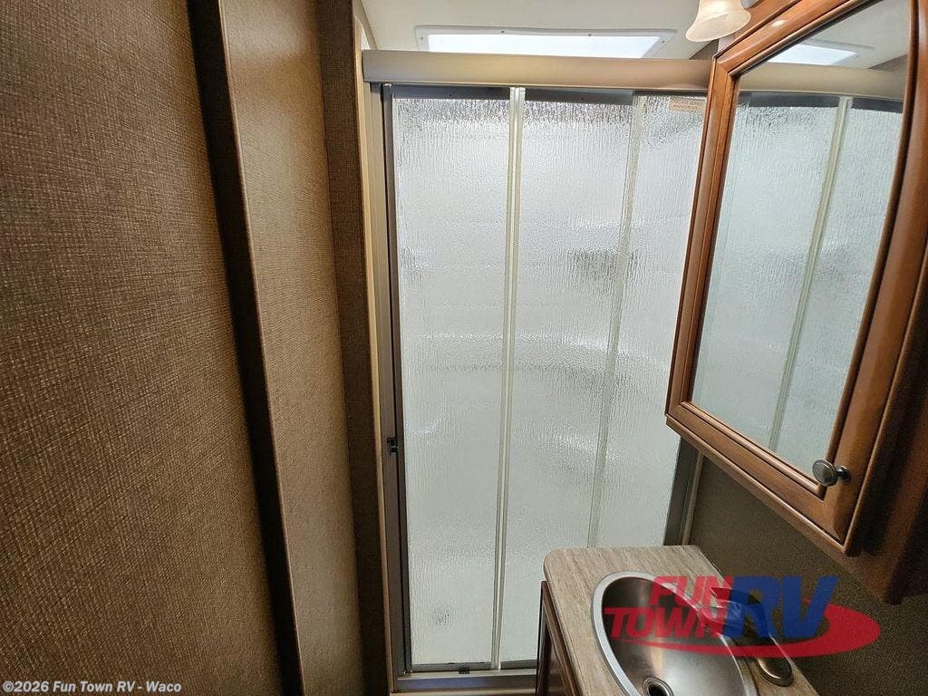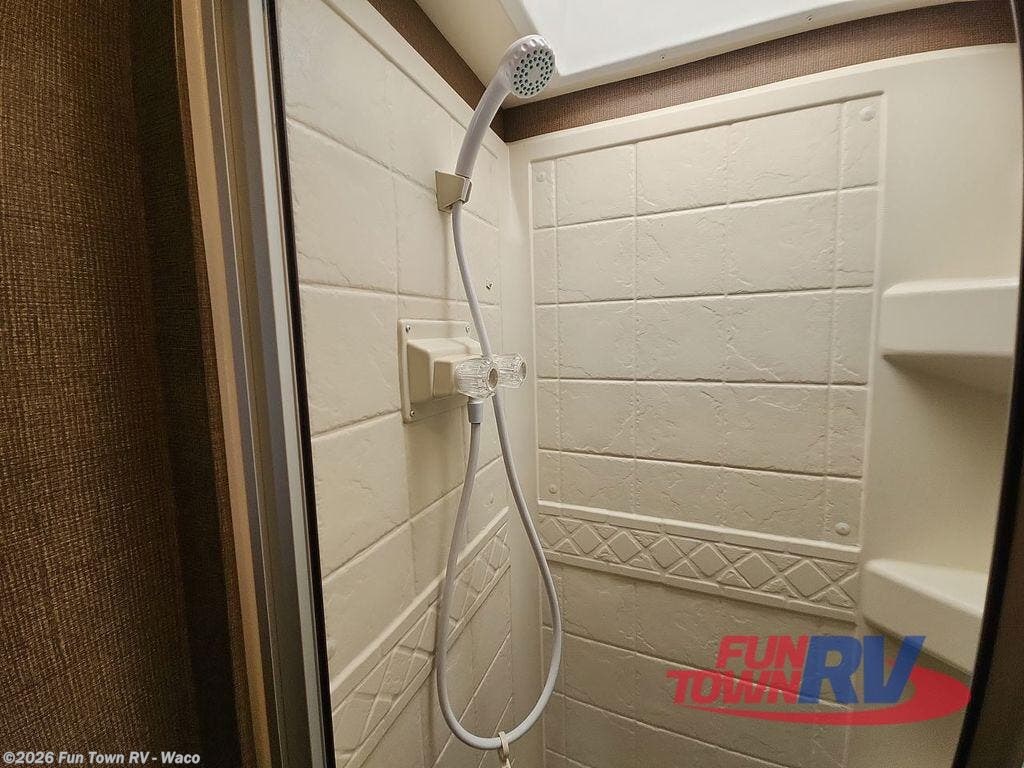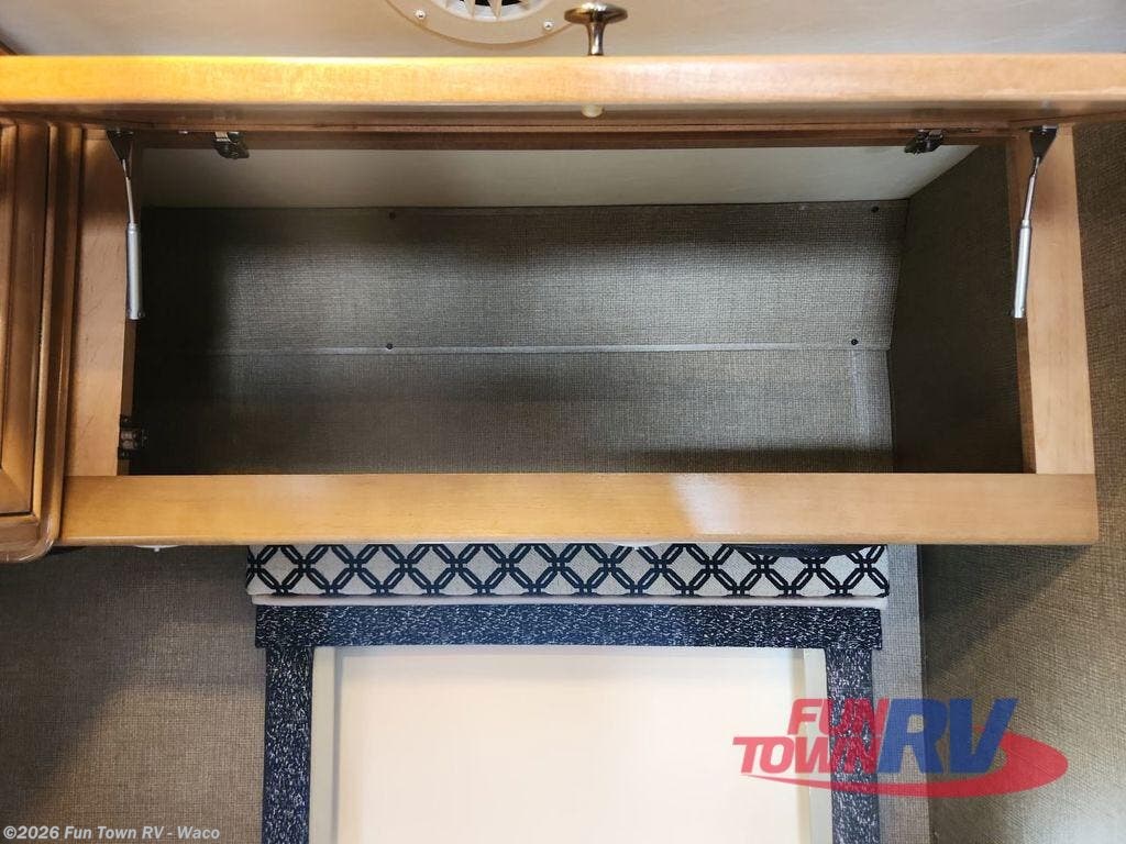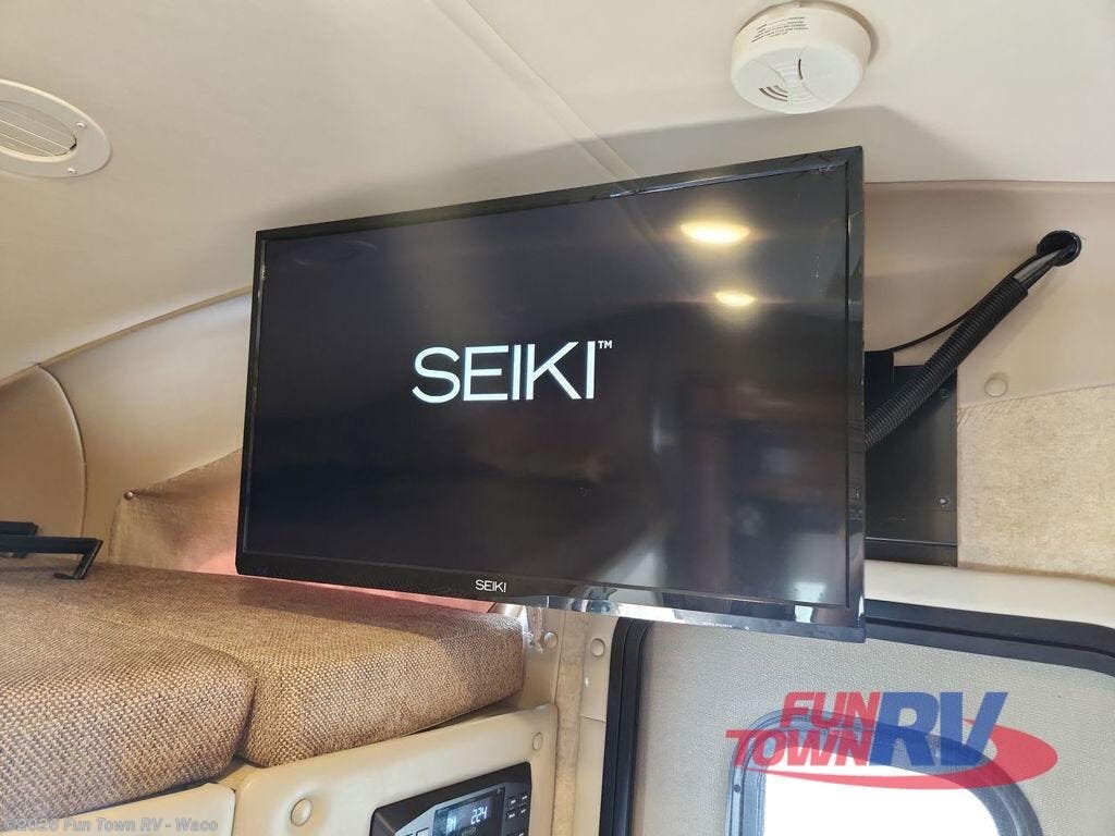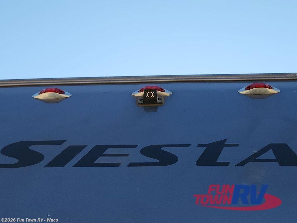 In the rear of the Siesta Sprinter 24SA you will find a corner bathroom including a shower, vanity sink, medicine cabinet, and a toilet. There is a closet just outside the bath. The opposite rear corner holds a full size bed with overhead cabinets and a 24" LED TV for your enjoyment.