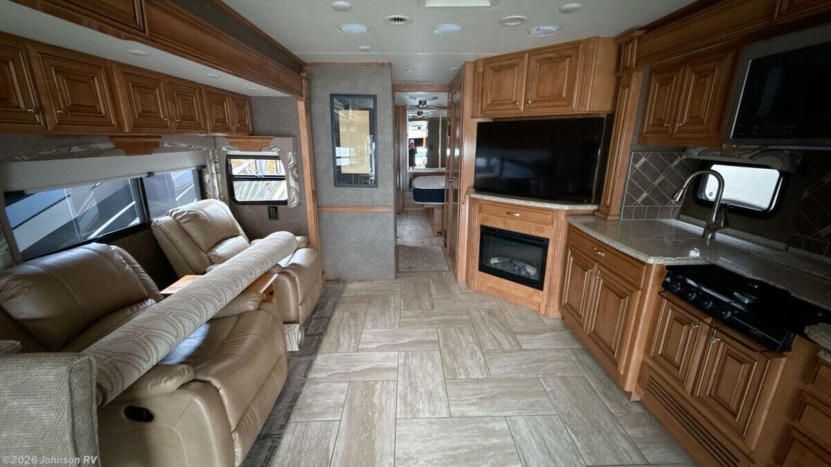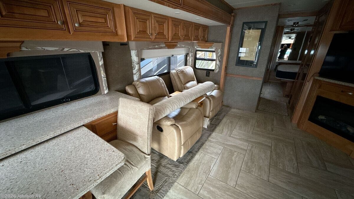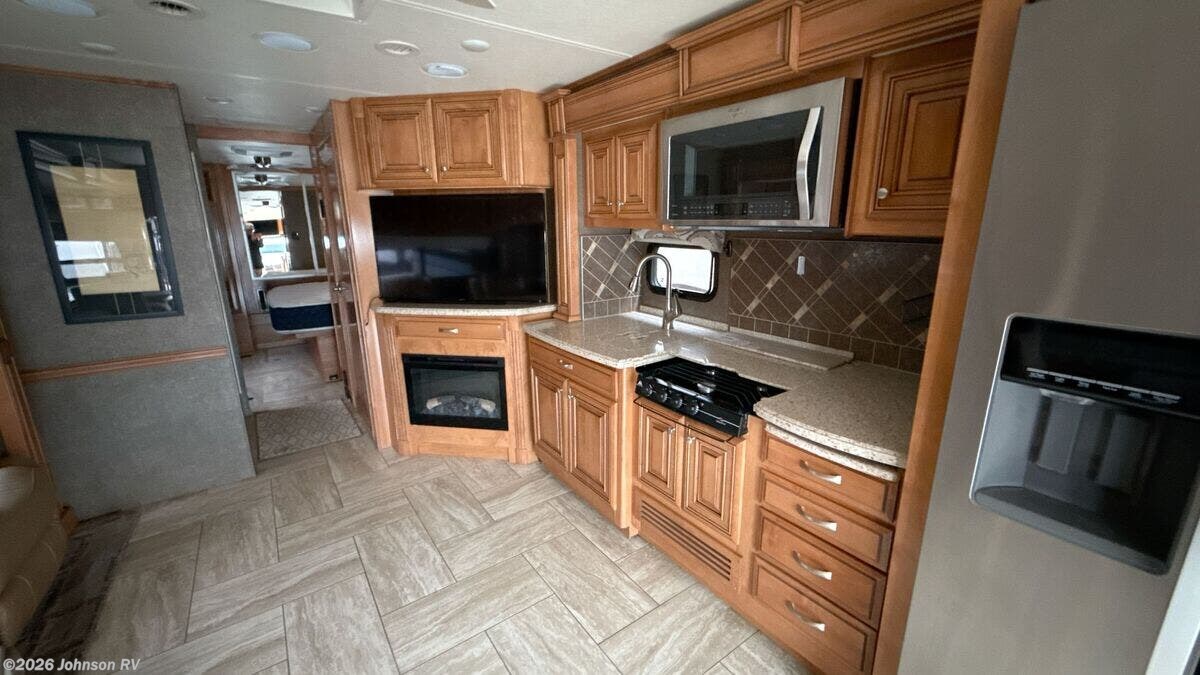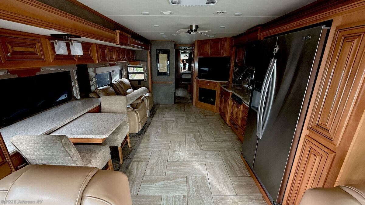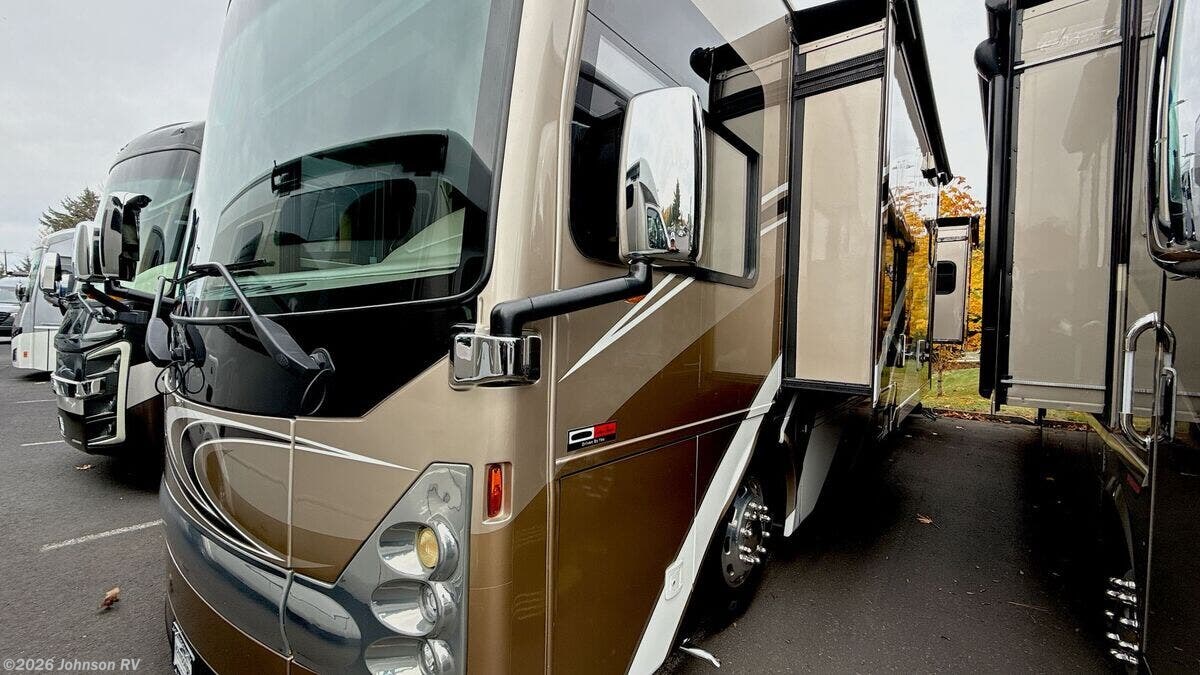 Features Include: 100-Gal Fuel Tank, Air Ride Suspension, Exhaust Brake, Aluminum Wheels, 10000# Hitch, Air Horn, Driving Lights, Fog Lights, Cab Features, Living Spaces, Electric Step Cover, LED Accent Lighting, Entertainment Center, Buffet Dinette (vbm), Pantry, Designer Backsplash, High-Rise Faucet, 3-Burner Gas Cooktop, Systems Center, Large LED HDTV, Blu-Ray Home Theater, Overbed Storage, Reading Lights, King Bed 72x80, Pillowtop Mattress, Nightstands, Wardrobes, Dresser Drawers, 32-inch LED HDTV, Two 13-inch LED TVs, DVD Player Bathroom, Medicine Cabinet, Vanity Sink, Linen Storage, Porcelain Toilet, 126# LP Capacity, Four House Batteries, 50-Amp Service Cord, 100-Amp Converter, 2000w Inverter, EZ Flow Water Panel, 10-Gal DSI Hot Water, Welded Aluminum Cage, Fiberglass Laminate, Seamless TPO Roofing, Roof Access Ladder, LED Accent Lighting