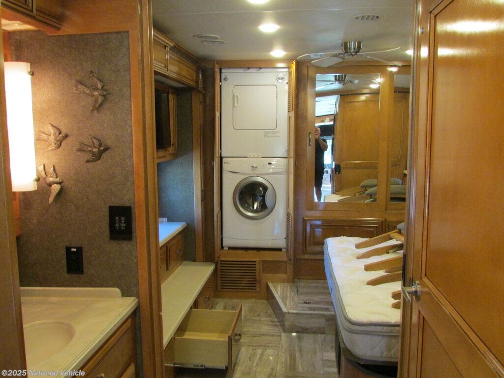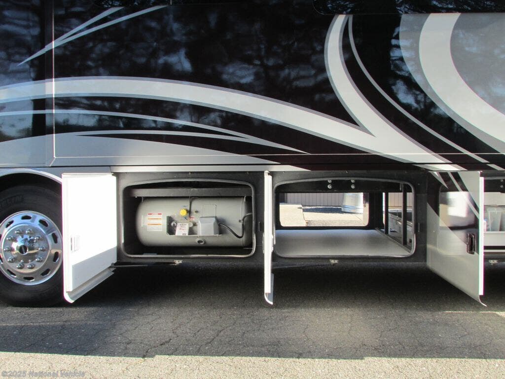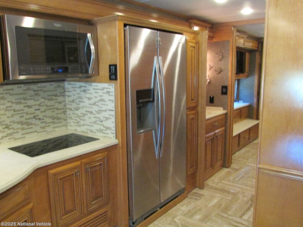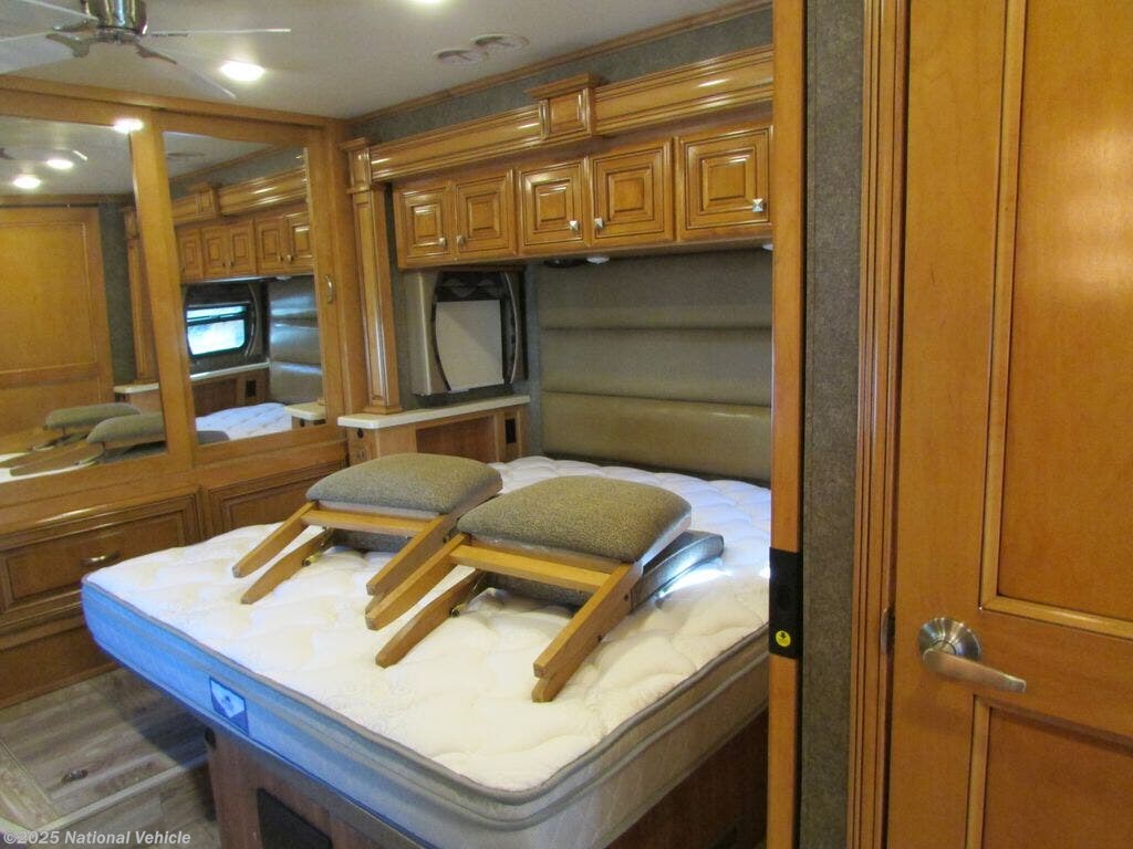Inside, the 37M impresses with a spacious triple-slide floorplan featuring elegant tile flooring, high-gloss cabinetry, and upscale furnishings. The living area includes a large sofa, theater seating, and a retractable TV, creating a perfect entertainment space. The gourmet kitchen is equipped with solid-surface countertops, a residential refrigerator, induction cooktop, convection microwave, and ample storage, ensuring you can prepare meals with ease on the road. The master suite offers a king-size bed, abundant wardrobe storage, and a private rear bath with dual sinks and a large shower, plus the convenience of an additional half bath mid-coach.
