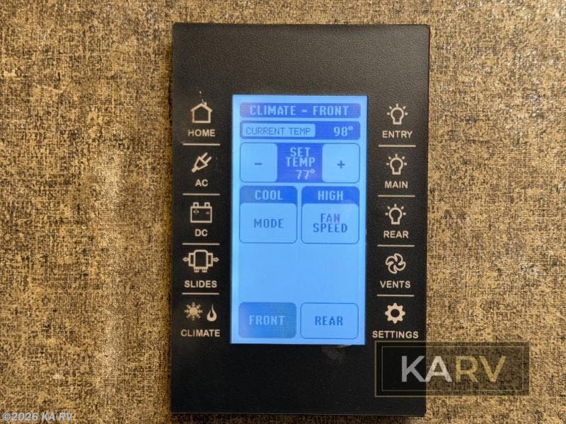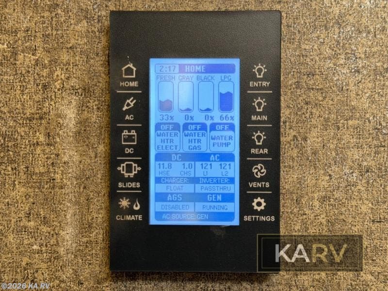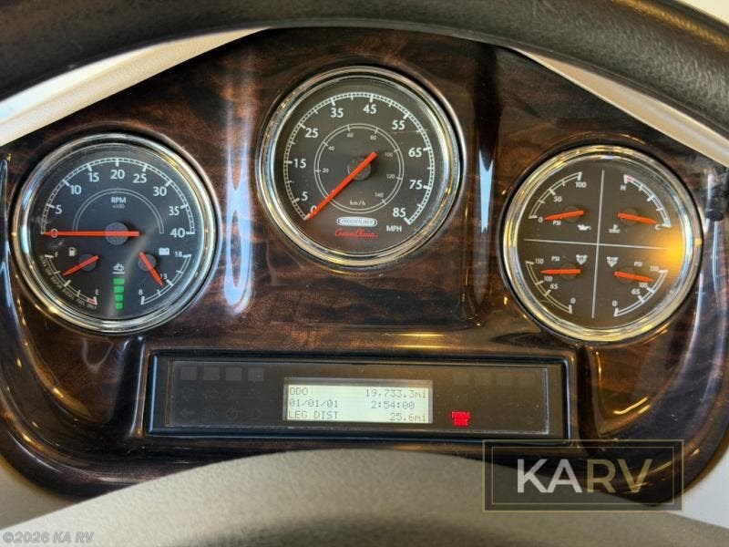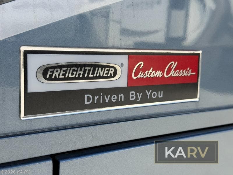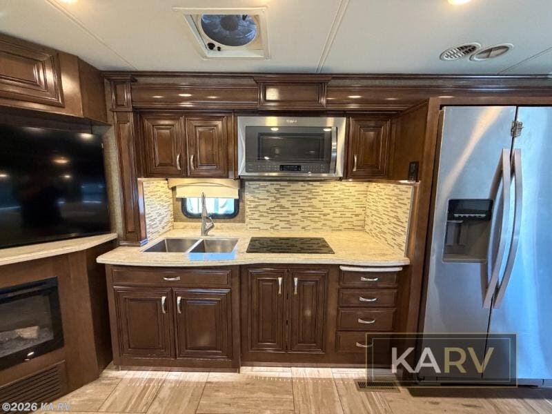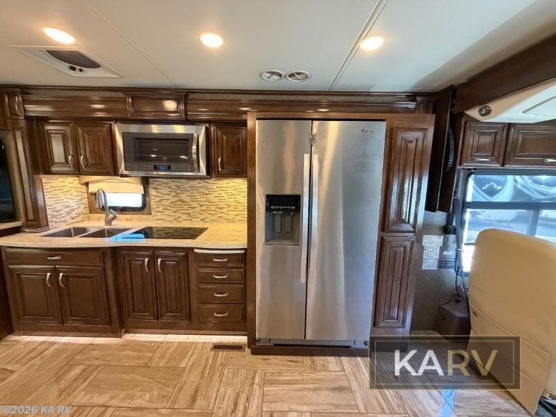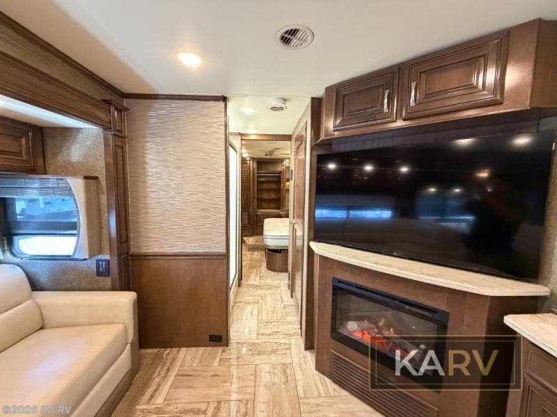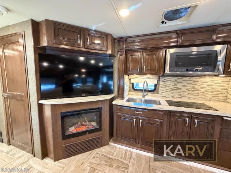 Behind the passenger seat there is a slide out with a dinette and four chairs, a buffet dinette, plus a sofa with air bed. Along the opposite side of this motor home you will find another slide out with a pantry, a residential refrigerator, a c'top extension, a two burner range, overhead microwave, and a double sink for easy clean up. Adjacent to the slide out there is a corner 55" LED Smart HDTV and a fireplace below which will come in handy on those chilly evenings.